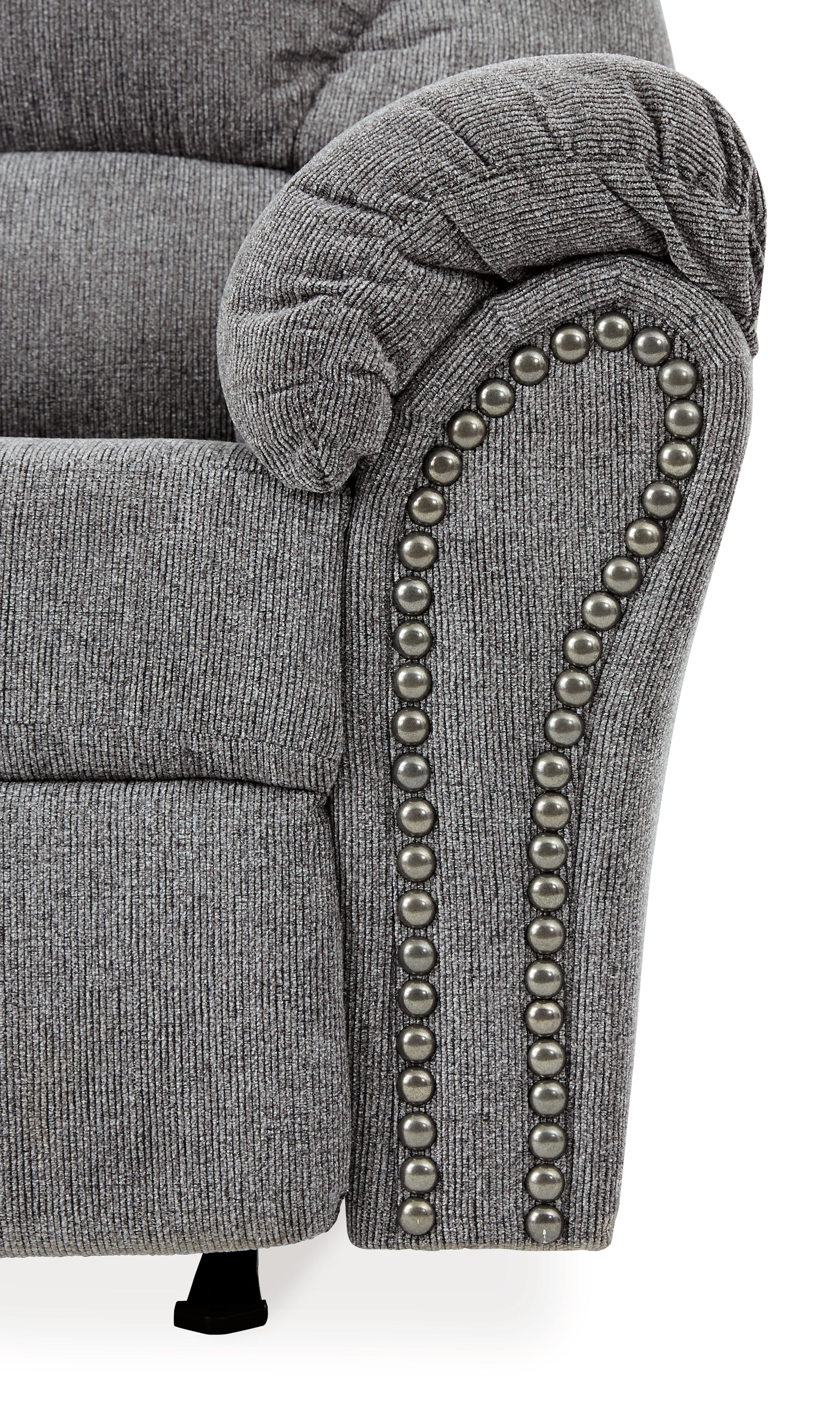 Why sacrifice comfort for style (or style for comfort) when you can have the best of both in this rocker recliner in pewter gray. Elements include a chic divided-back design and pillow top wrapped armrests that make nodding off all too easy. Calling attention to the elegantly flared armrests—black nickel nailhead trim for a punch of cool character.