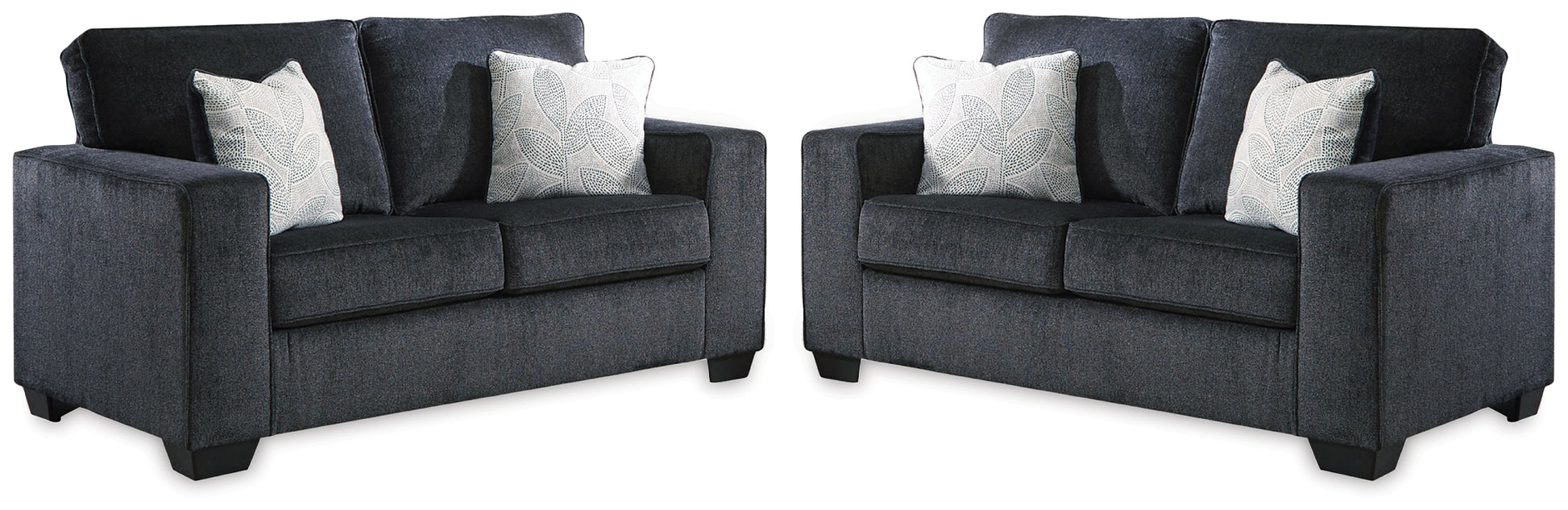 If style is the question, then this pair of matching loveseats is the answer. Sporting clean lines and sleek track arms, the decidedly contemporary profile is enhanced with plump cushioning and a chenille-feel upholstery that\'s so pleasing to the touch. Sure to play well with so many color schemes, this loveseat in slate gray includes a pair of understated floral pattern pillows for fashionably fresh appeal.