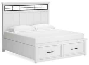 This king panel storage bed delivers casual style with substance. An inset metal detail on the headboard displays a unique take on modern farmhouse design. The bed\'s sturdy silhouette, classic white finish and black pulls exude a comfortably cozy vibe in your soothing sanctuary. Storage drawers are spacious enough for all your essentials.