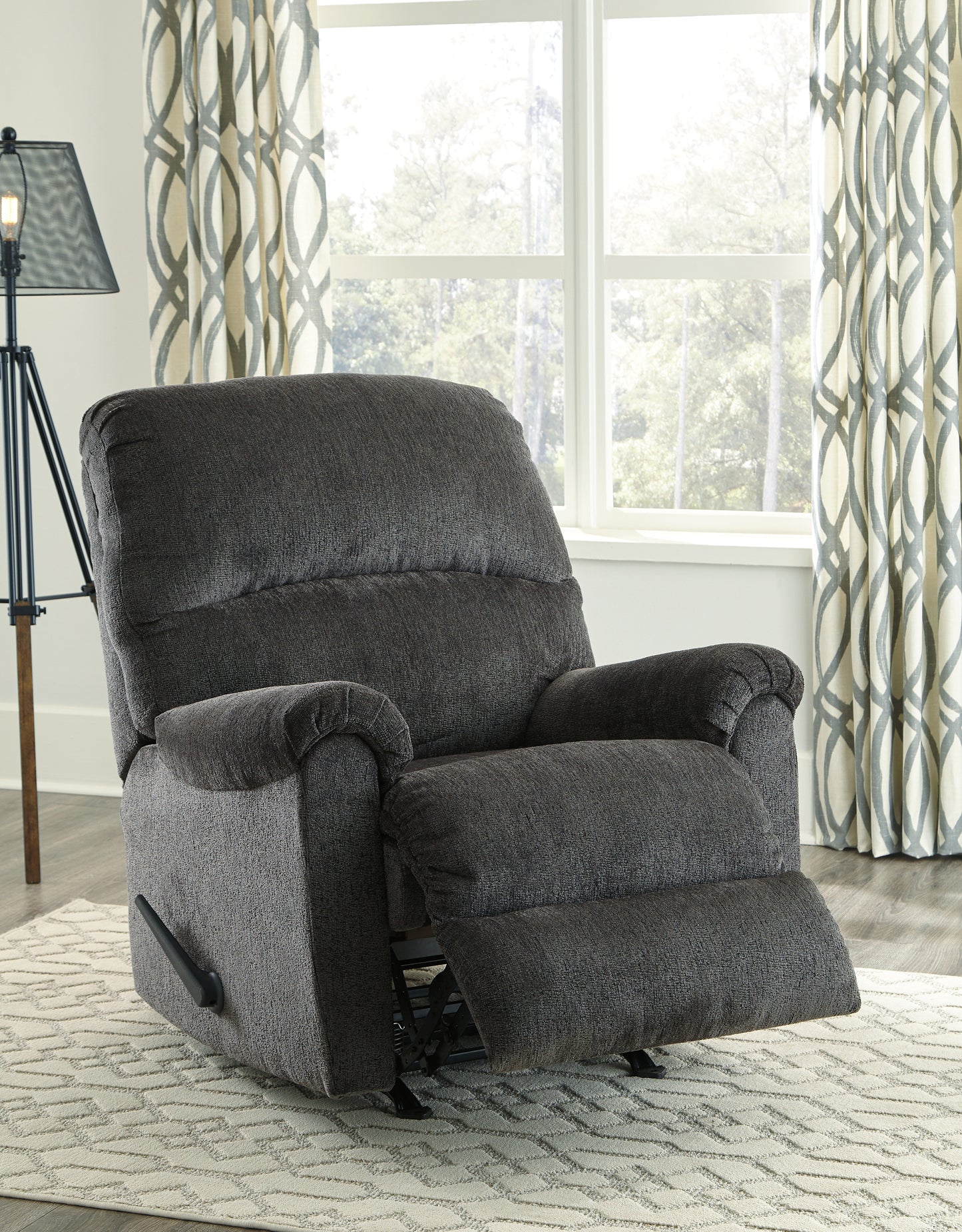 A mastery in \"less is more,\" this rocker recliner manages to make cool, contemporary design so warm and cozy. Its smoky gray upholstery, incredibly plush to the touch, is a new twist on neutral. A curved divided back and a deeply tufted footrest give the clean-lined profile a sense of sumptuousness that\'s impossible to resist.