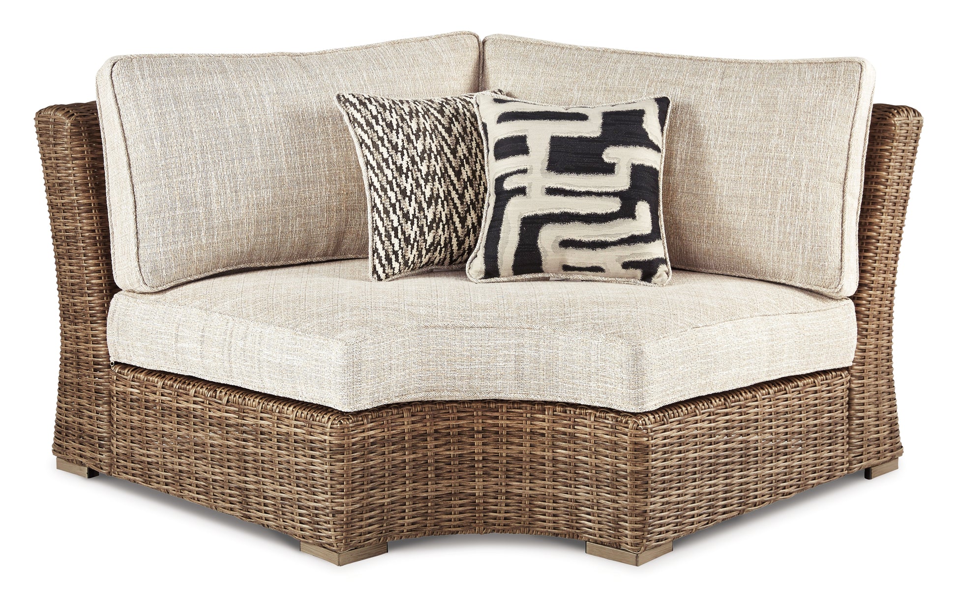 Sporting an easy-on-the-eyes look inspired by driftwood, this curved corner chair with cushion elevates the art of alfresco living. Beautiful and durable enough for indoor and outdoor use, the high-style/low-maintenance seating entices with plush, removable cushions wrapped in Nuvella® fabric that’s a breeze to keep clean.