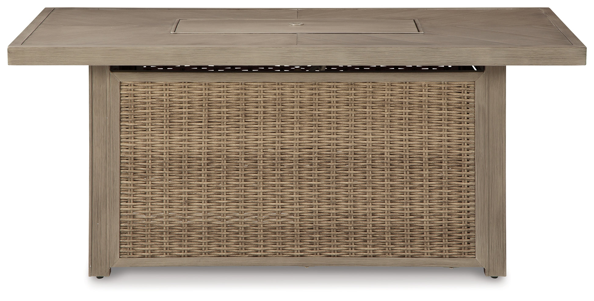 Sporting an easy-on-the-eyes look inspired by driftwood, this fire pit table elevates the art of alfresco living. Its chic chevron-patterned top is paired with all-weather resin wicker over rust-proof aluminum for beauty and brawn. A stainless steel burner with glass beads adds a captivating element sure to wow.