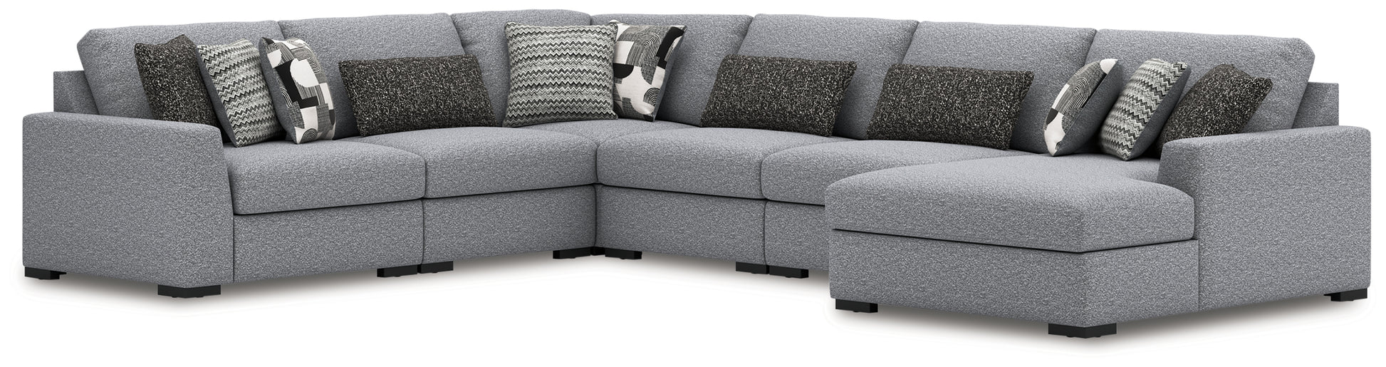 Includes 6 modular pieces: left-arm facing corner chair, 3 armless chairs, wedge and right-arm facing corner chaise,
