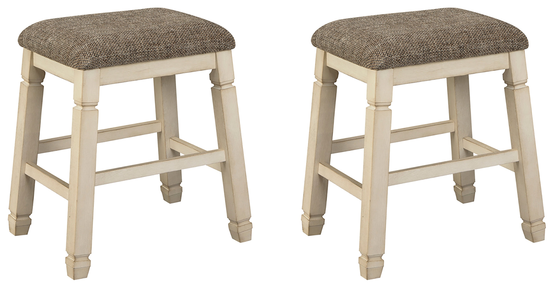 The beauty of this upholstered bar stool is something to savor. Designed to serve up comfort and flair, this backless bar stool entices with a saddle seat covered in a heavy woven fabric that complements the antiqued white finish.