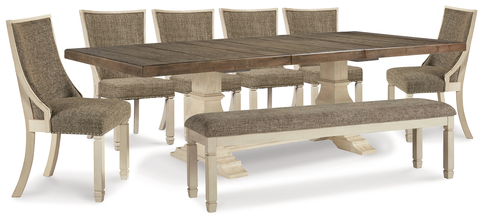 Whether your style is farmhouse fresh, shabby chic or country cottage, you\'ll find this extension dining table works on so many levels. The table\'s two-tone finish, with weathered gray on the tabletop and textured antiqued white on the double-pedestal base, offers twice the character and twice the appeal. An extension leaf makes it easy to comfortably add more guests in no time. 6 chairs and bench included.