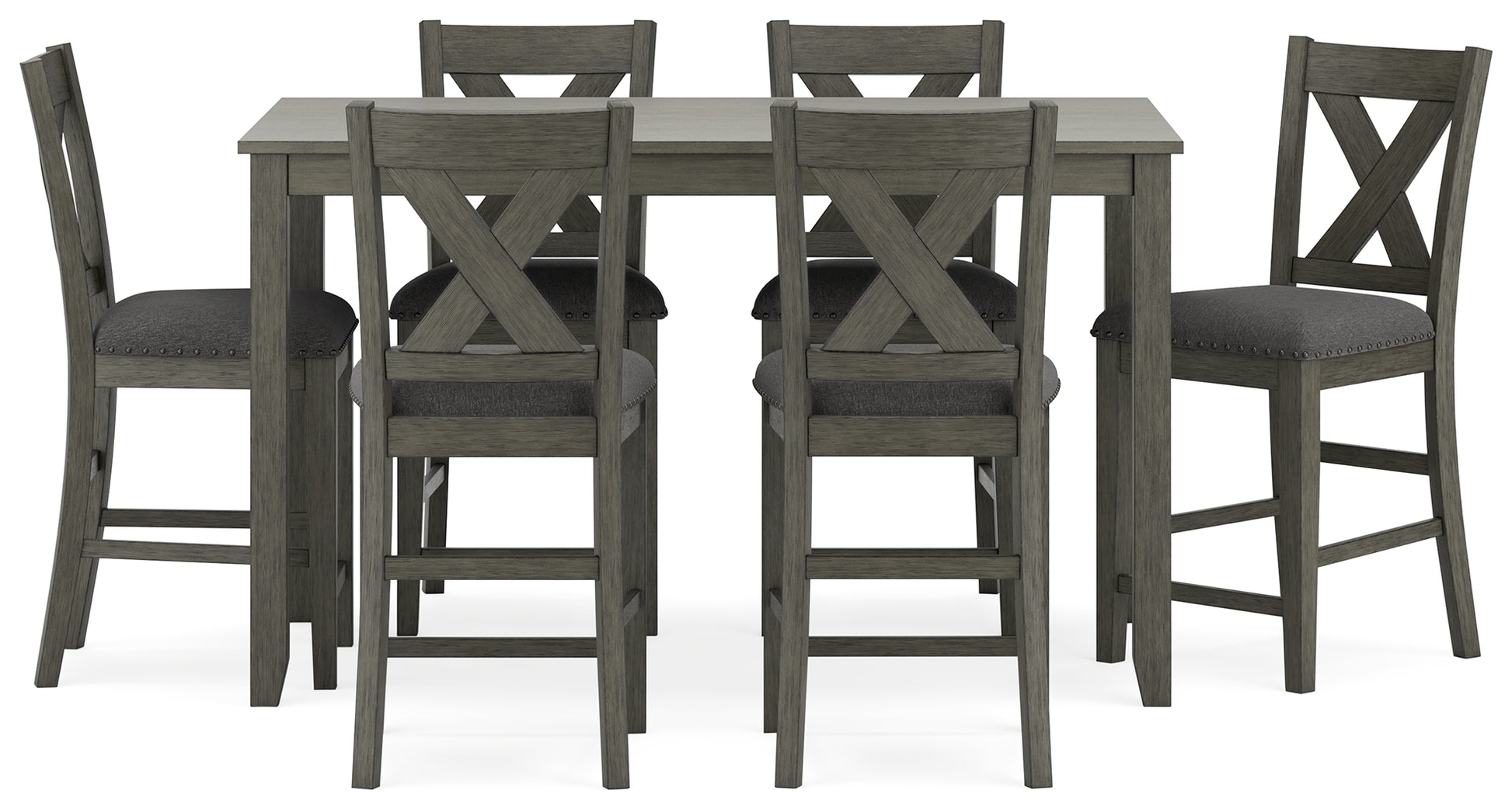 Perfect portion. Striking a simply chic pose, this counter height dining set is crafted with fascinating flair. A subtle gray wash finish gives the clean-lined design a casually cool sensibility. Plushly cushioned seats in a soft, neutral upholstery add to the allure. During casual get-togethers, daily dinners and family game nights alike, this set serves up stylish function.