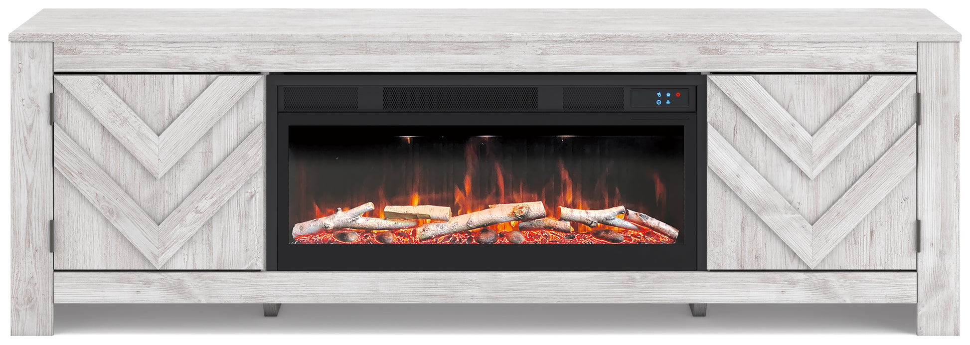 This TV stand with electric fireplace embraces a classically charming aesthetic and repurposes it for modern living. Its whitewash replicated paint appeals to your love of vintage character, while the chic chevron pattern is effortlessly on trend. Media accessories stay tucked away in style thanks to hidden storage behind the doors. And for added ambiance, the electric fireplace brings a cozy-cool vibe to your living room. With the touch of a button, activate the LED-lit flame and adjust the temperature or the flame brightness. The flame effect includes multiple color options and a realistic-looking faux birch log set.