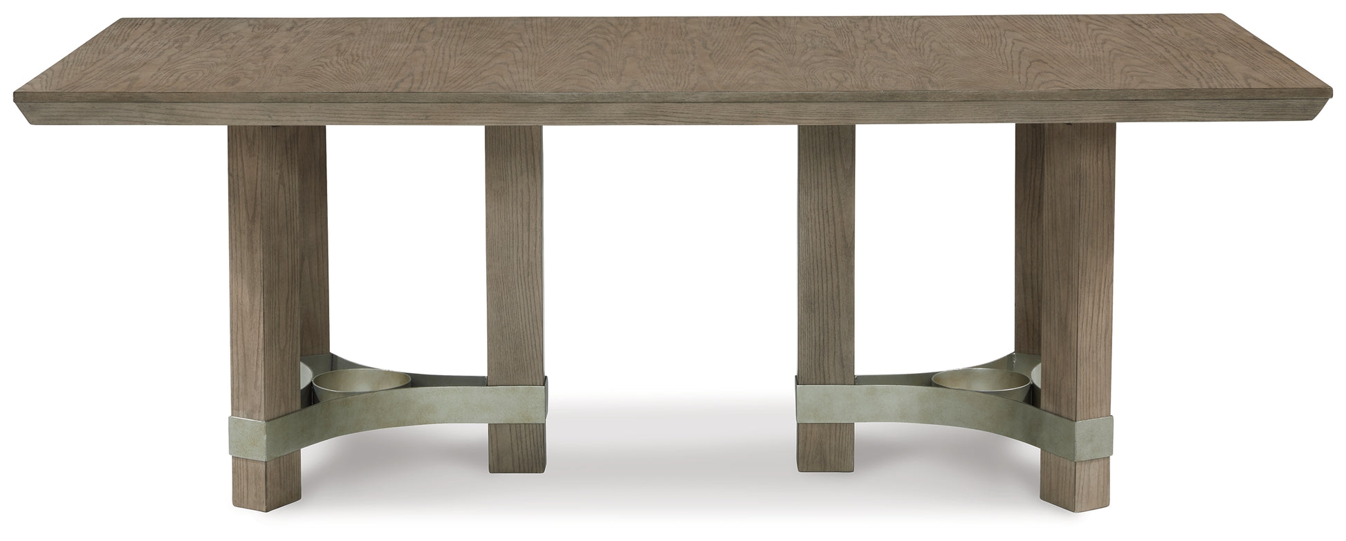 You want your dining room to reflect your refined sensibilities while remaining forward-thinking in design. The simple silhouette of this dining table opens the door to a dining room with the curated look and subtle flair you desire. The piece\'s elegant waxy gray finish gets an added touch of luxury with a double-pedestal base and beveled-edge top, showing remarkable attention to detail. Whether you\'re hosting family meals or holiday entertaining, this table is a place to gather around in streamlined style.