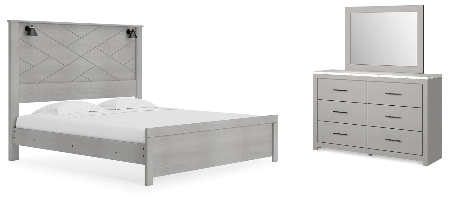 Cool, clean and casually modern. This bedroom package’s wispy dove gray finish and replicated marble set the tone for your calming sanctuary. Large linear drawer pulls add dimension and authenticity, while the bed\'s abstract headboard design brings a fresh look to the set.