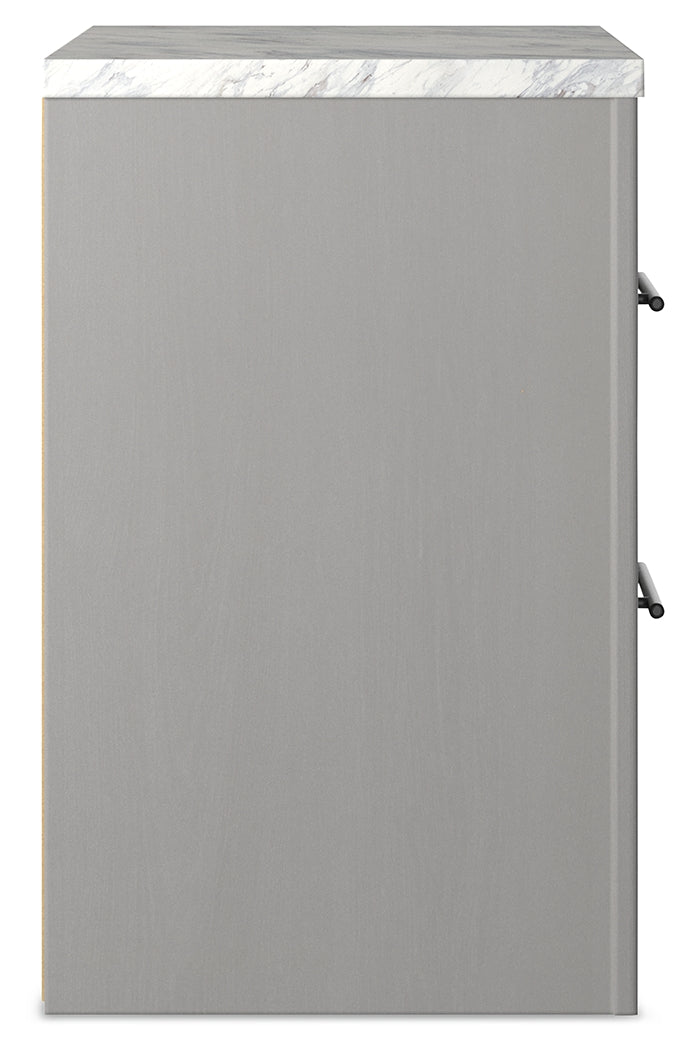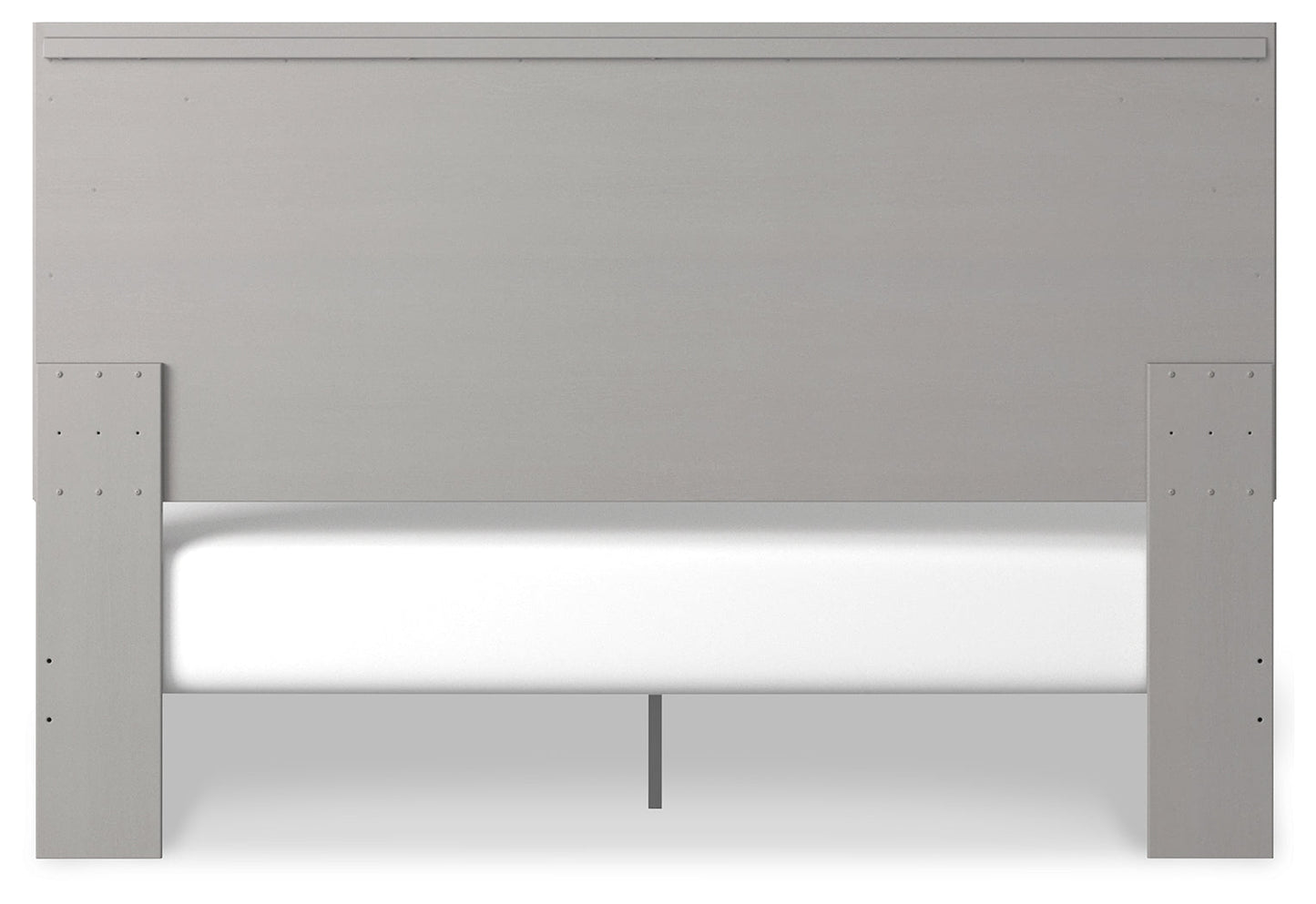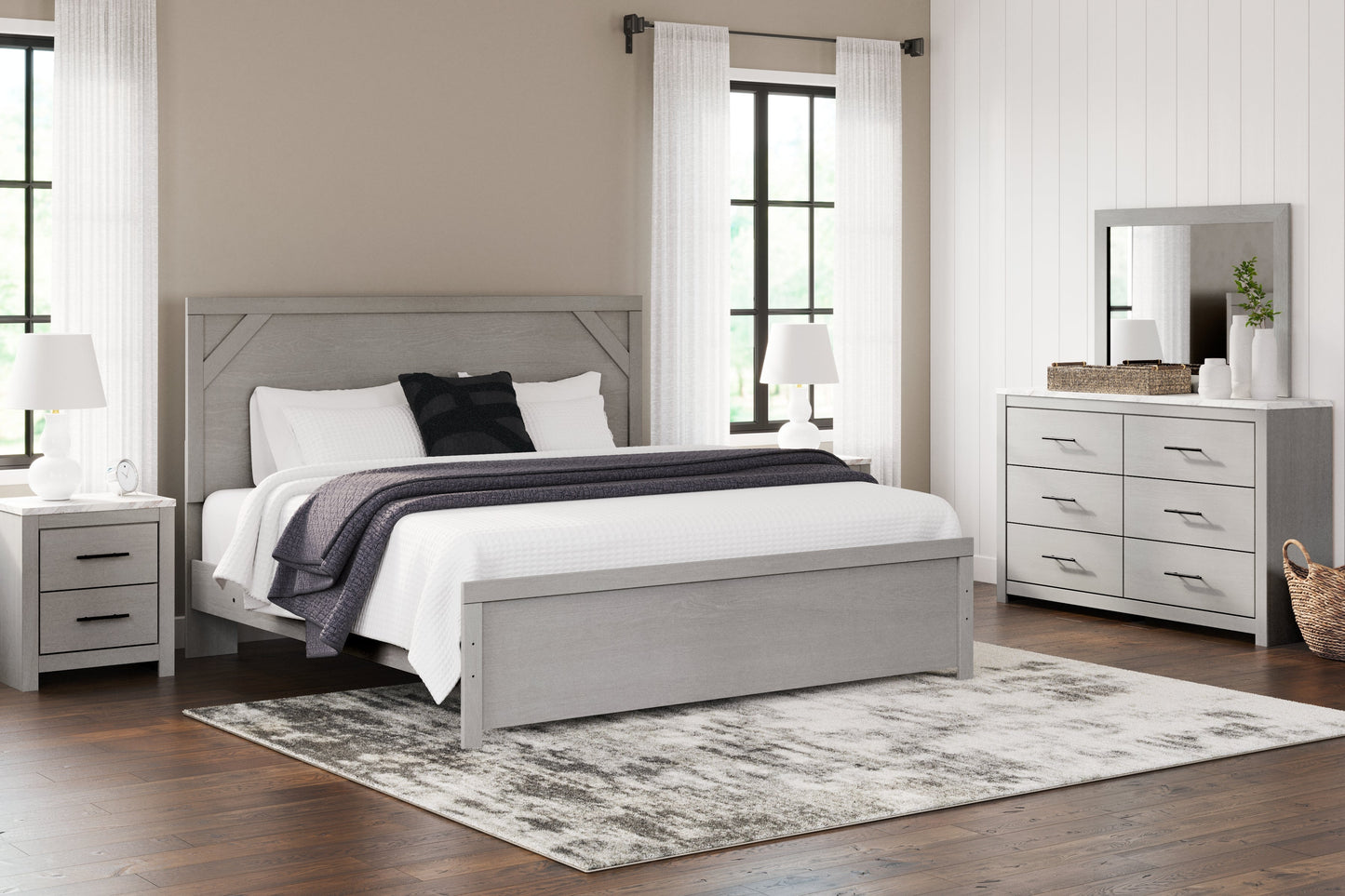 Cool, clean and casually modern. This king panel bed’s wispy dove gray finish sets the tone for your calming sanctuary. Framed elements and cross-brace accents add dimension and authenticity to the bed’s simply stunning profile. Dresser, mirror and nightstand included.