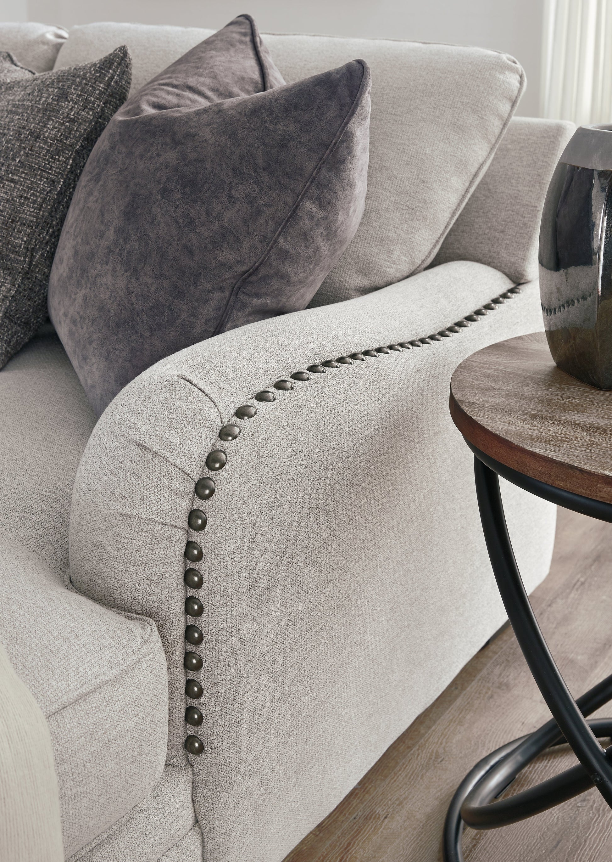 Looking for a \"transitional\" look that’s as comfortable in contemporary spaces as it is in classic surroundings? Rest your eyes on the beauty of this sectional. The soft, tight woven texture and chalky beige hue are so in the now. Gracefully curved arms punctuated with oversized nailhead trim infuse a sense of everyday elegance.