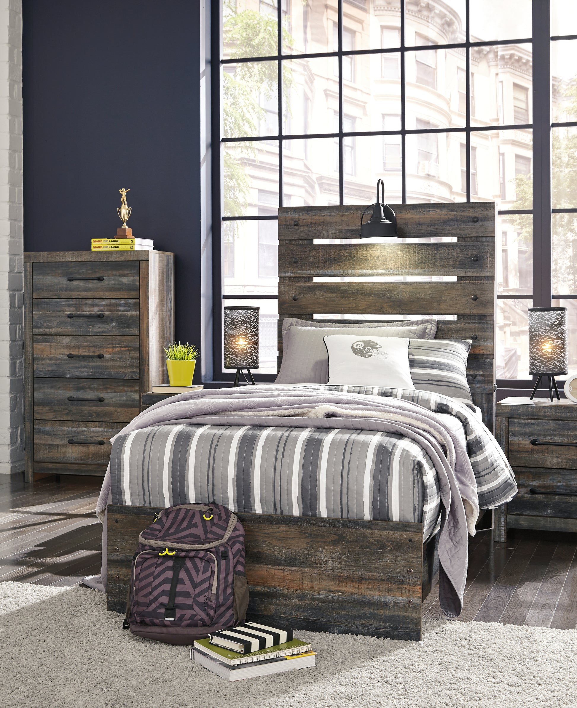 When merged in just the right way, rustic and industrial styles can make one happy marriage. Case in point: this twin panel bed. A refined take on barn board beauty, its complex, replicated wood grain showcases hints of burnt orange and teal tones for a sense of weatherworn authenticity. Those who love to read in bed are sure to find the retro-chic light sconce and USB plug-ins on the open-slat style headboard such a bright idea.
