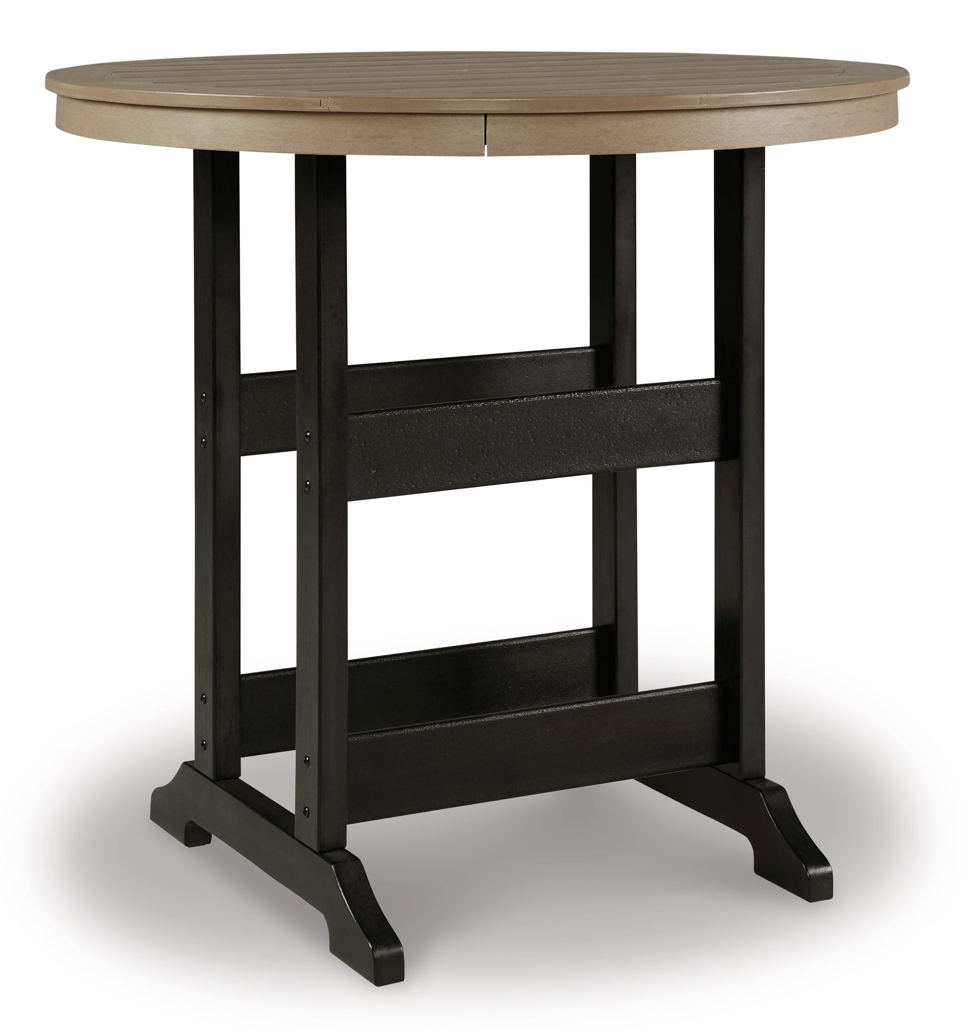 Raise the bar on outdoor living with this round bar table and bar stool set. Crafted for style, comfort and durability, the set impresses with a standout two-tone finish that pairs a light driftwood-look and black finish for twice the interest. Round table design keeps everyone in the flow of conversation, while the stools cater with sturdy armrests, an ample footrest, high shell back and waterfall wrapped seat for curvaceous comfort.