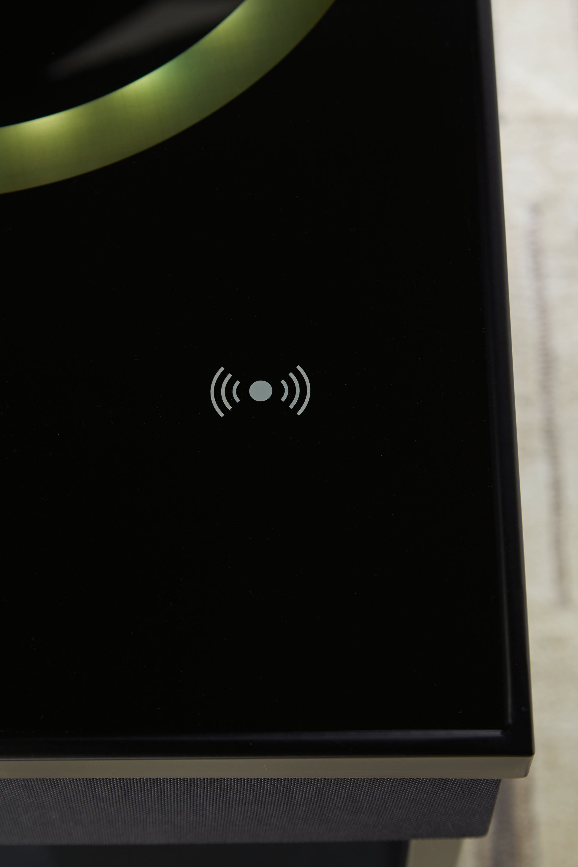 Glass tabletop with wireless charging and touch-button controls,