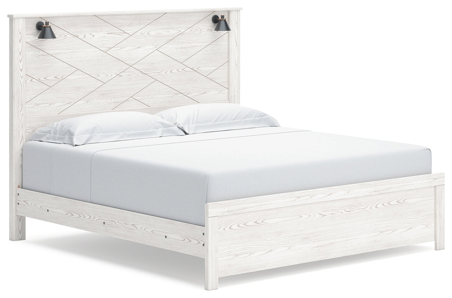Cool, clean and casually modern. This king panel bed’s wispy whitewash finish sets the tone for your calming sanctuary. Framed elements and cross-brace accents add dimension and authenticity to the bed’s simply stunning profile. Chest and 2 nightstand included.