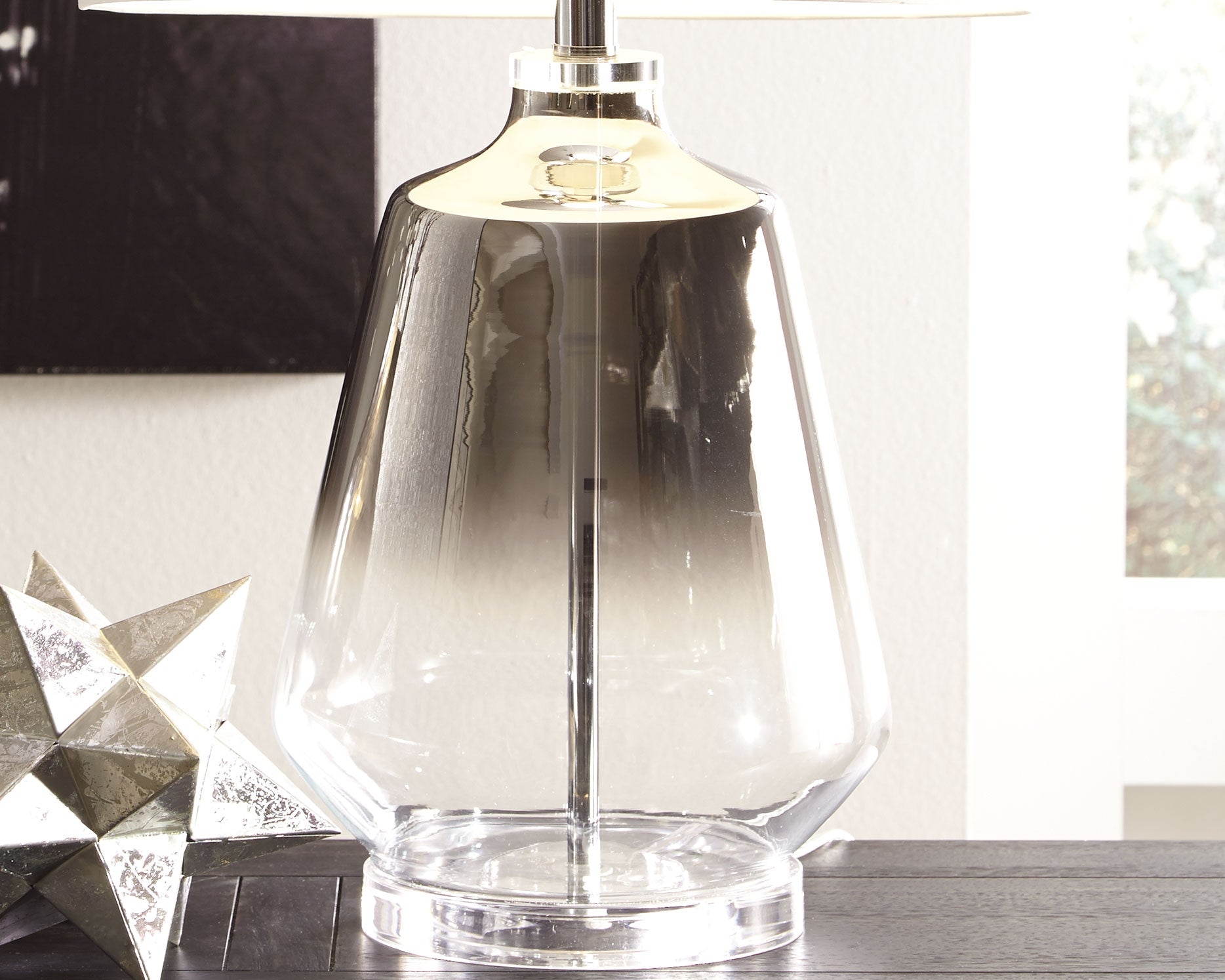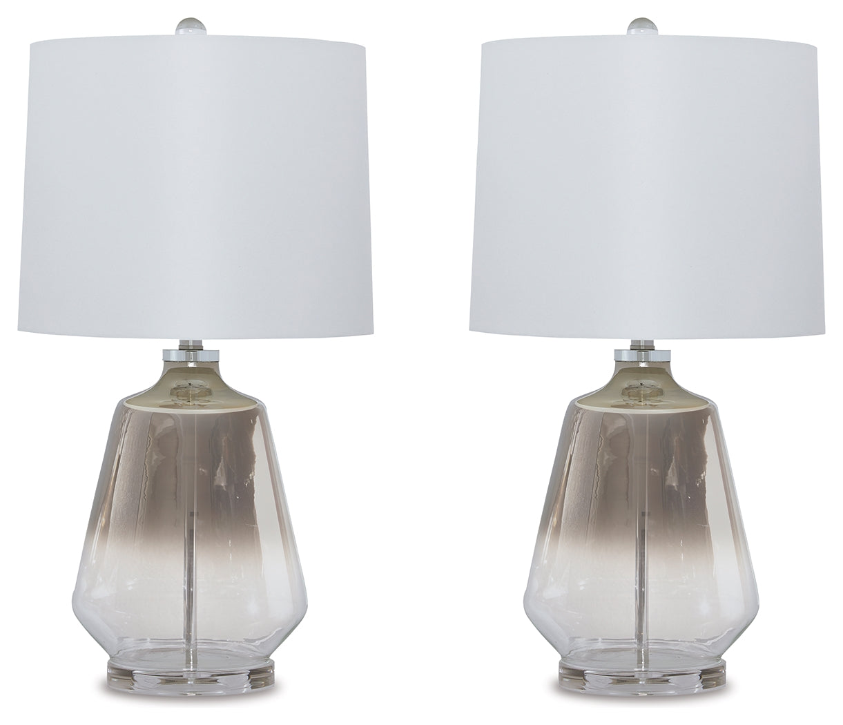 Heart of glass. A translucent glass base with a metallic ombre effect makes this table lamp set a chic choice if you delight in contemporary style. The high-style table lamp set with a 3-way switch is topped with a modified drum shade and enriched with silvertone metal accents.