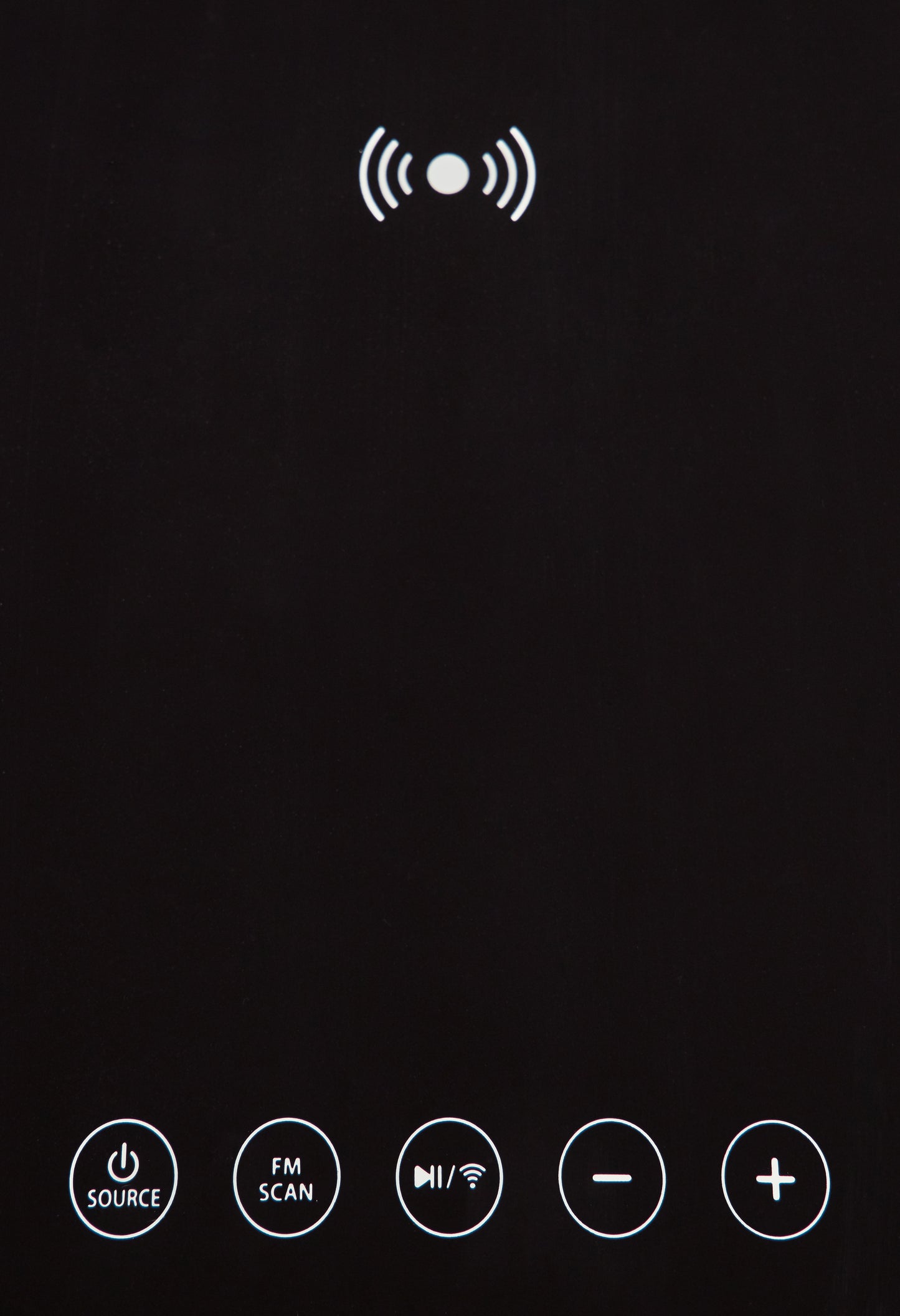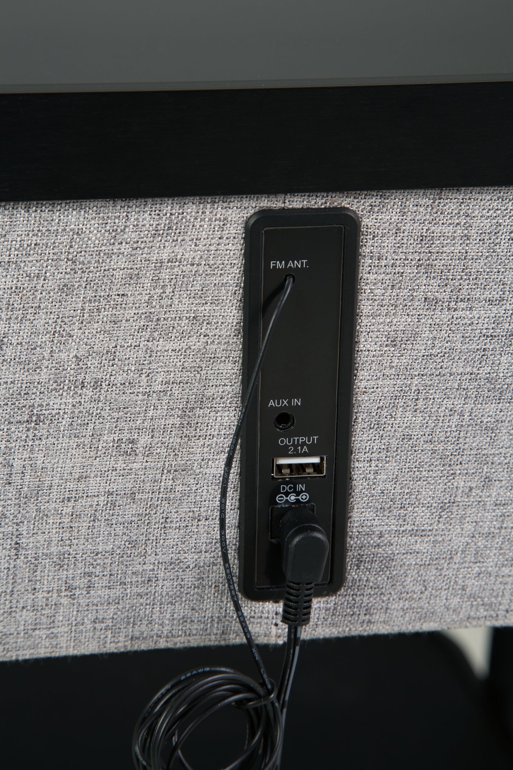 If you\'re a fan of sleek, space-saving design, this accent table will be music to your ears. In tune with your lifestyle, it features an integrated speaker that connects wirelessly to your favorite songs. Its glass top (with wireless charging and touch-button controls) harmonizes perfectly with neutral gray fabric on the sides. This contemporary table hits all the right notes for form and functionality.