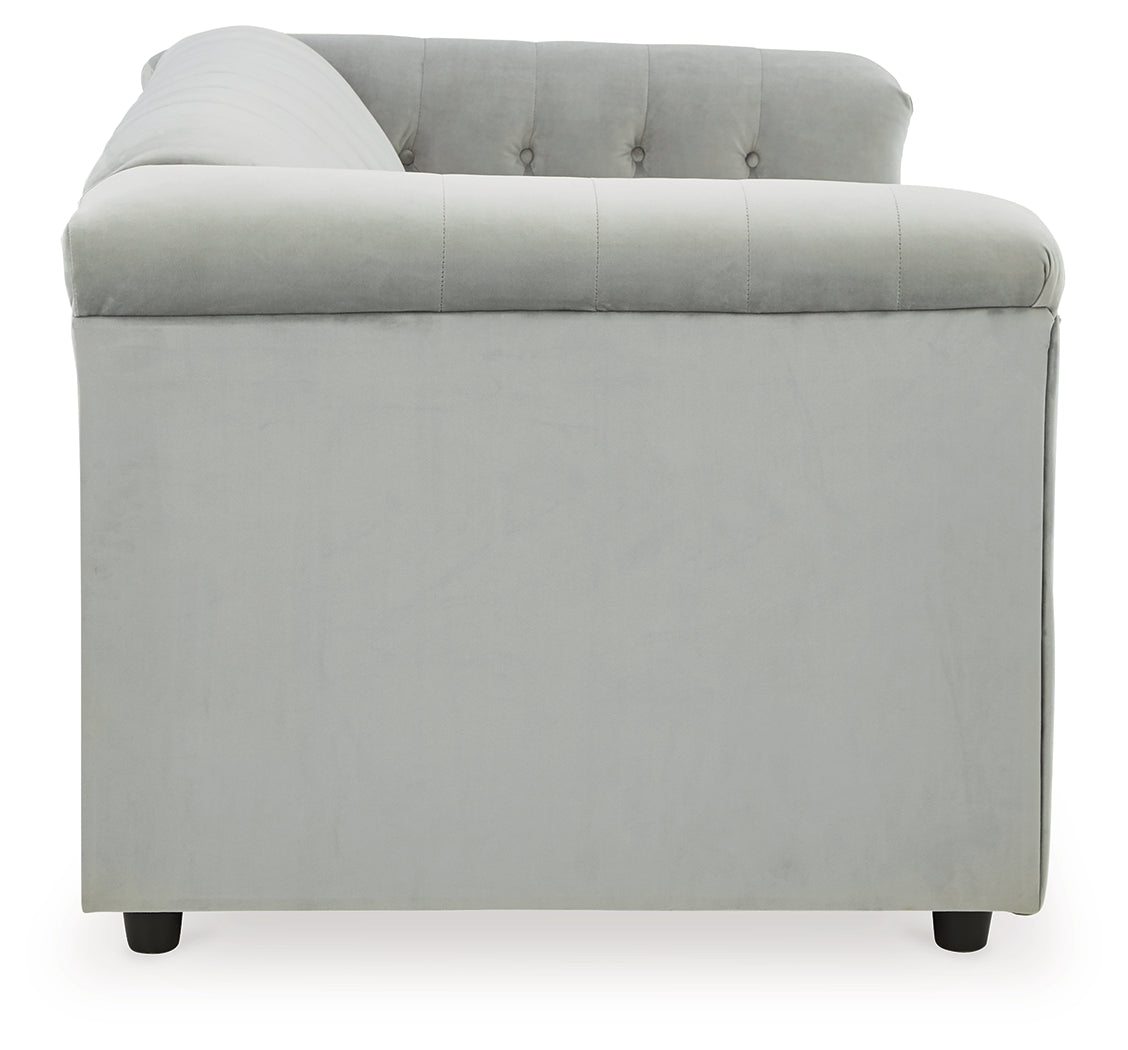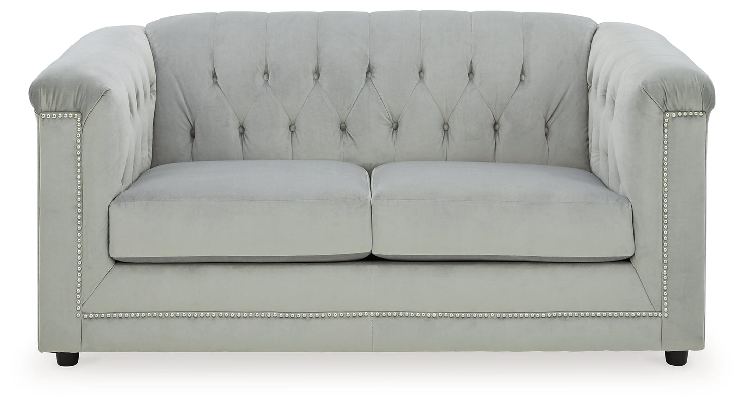 With a timeless classic Chesterfield styling that\'s very much in vogue, this loveseat makes a brilliant statement. Its beautifully neutral silvery gray velvet fabric looks as good as it feels. Nailhead trim, button tufting and high shelter arms give the loveseat an effortlessly elegant appeal. The hidden leg design is an on-trend addition for modern spaces.