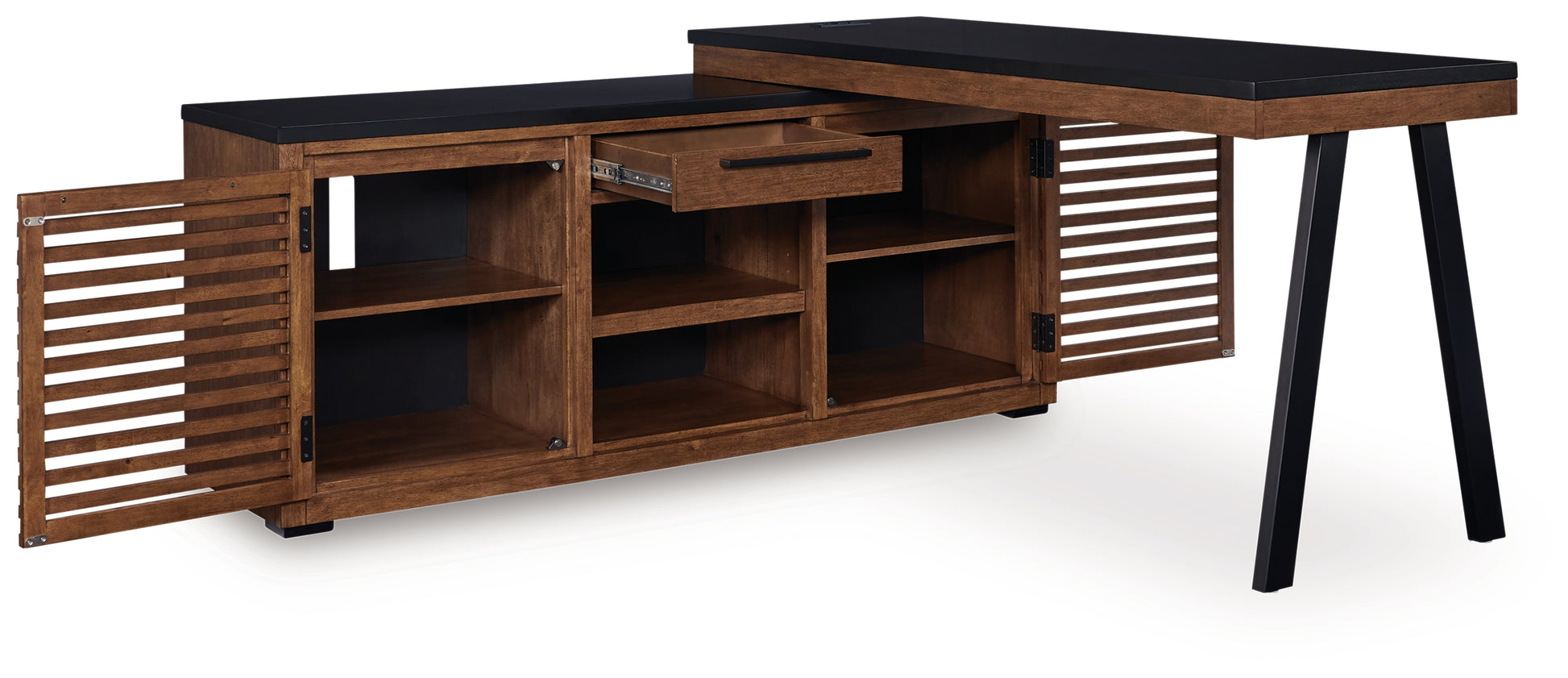Double down on casual chic with the two-tone look of this credenza with desk return. With its warm brown and matte black finishes, it reflects your eye for modern design. Trend-right slatted styling on the doors brings added charm. The desk can sit on either side of the credenza for added flexibility in compact spaces. And with its adjustable shelves, open storage and accessories drawer, keeping home office essentials organized is a breeze.