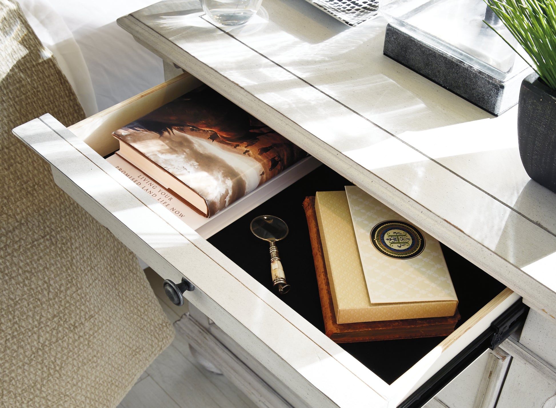 Give your retreat vintage charm with this king panel bed. In a beautifully distressed whitewash finish, you\'ll love the headboard\'s grand style featuring a picture framed panel. Generously scaled moulding from top to bottom, along with bun feet give this bed character—evoking the feel of a quaint cottage escape. Dresser, mirror, chest and 2 nightstands included.
