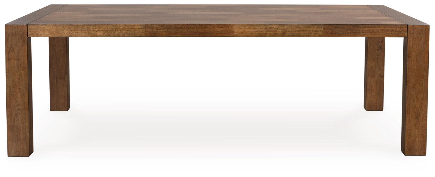 Experience worry-free living with this dining package. Designed to effortlessly blend casual and refined aesthetics, the rich brown butcher block veneer exudes a modern, relaxed vibe you\'ll love. Styled to comfortably seat eight, this piece makes room for one and all.
