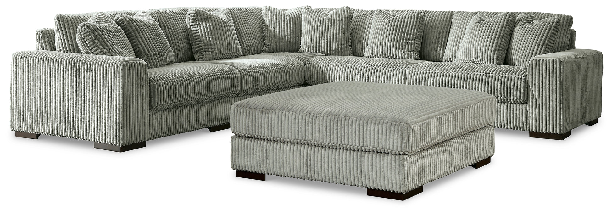 Plush and posh. Showcase your eye for on-trend texture with the statement-making cord upholstery of this sectional and ottoman package. Its stunningly soft fabric entices in a light gray hue, complementing contemporary color palettes. Sink into the cushions and plan to stay a while—this cozy living room seating set highlights your high-end approach to comfort and style.