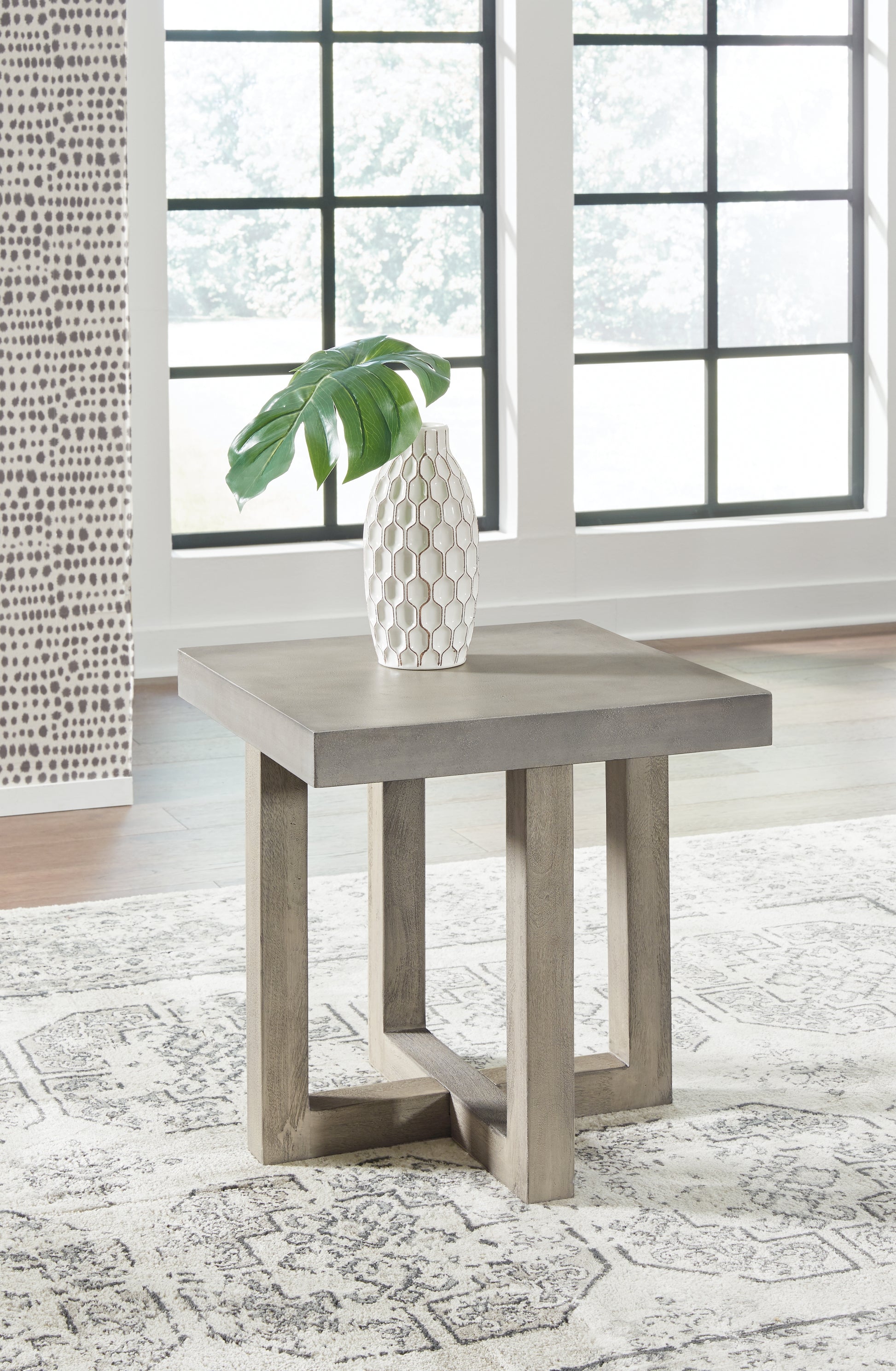 This end table is a stoic piece with a sense of casual luxury. Its faux concrete top has a sculptural feel and the matching gray washed base adds a hint of relaxed refinement. Simply place it beside your sofa on its own or in pairs to elevate your space with contemporary style in a snap.