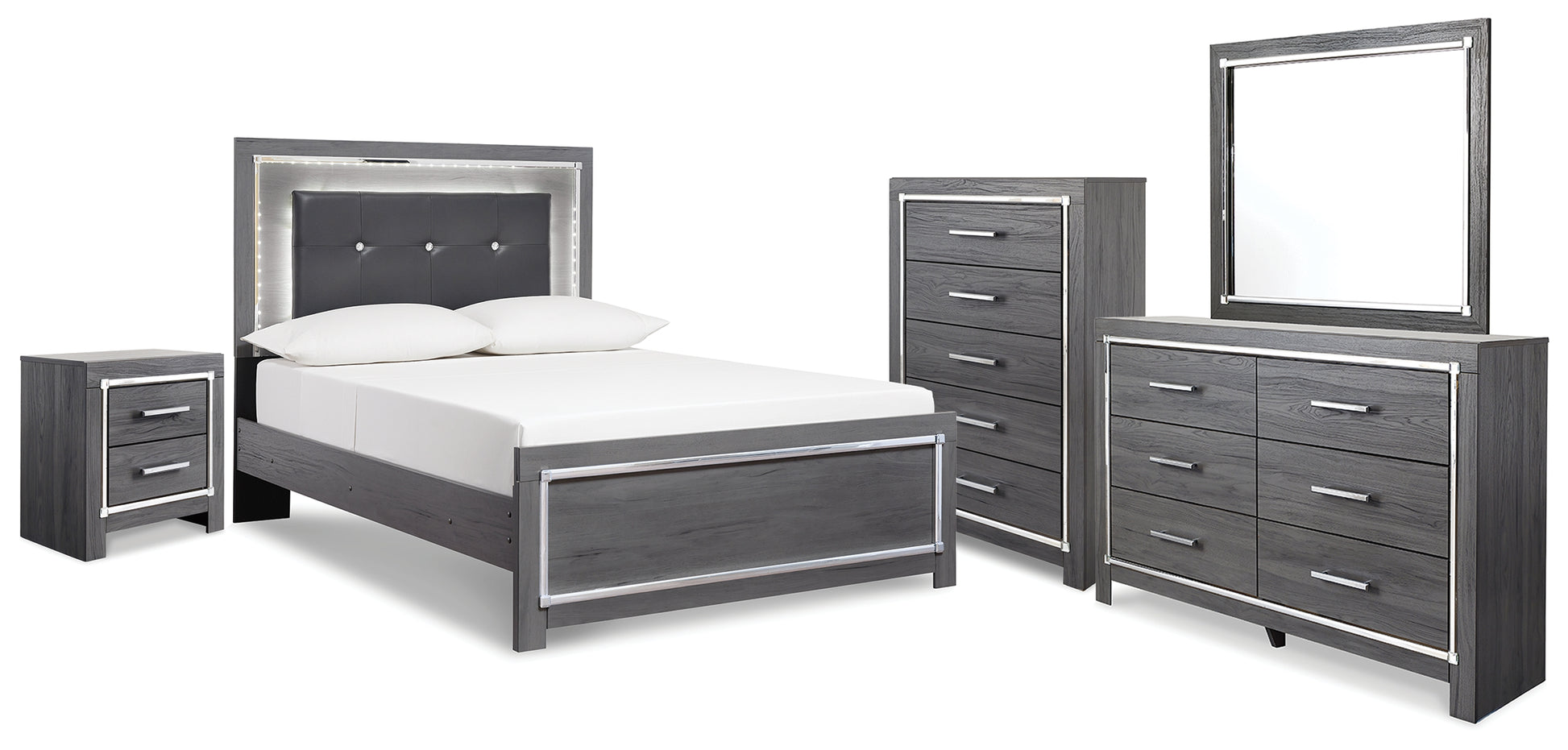 Reminiscent of Hollywood glamour of yesteryear, this full panel bed interprets luxury in a decidedly modern way. Sumptuous details include button-tufted upholstery, faceted faux crystals and chrome-tone accents beautifully lit by LED lights enhanced with remote-controlled settings for color and brightness. Dresser, mirror, chest and nightstand included.