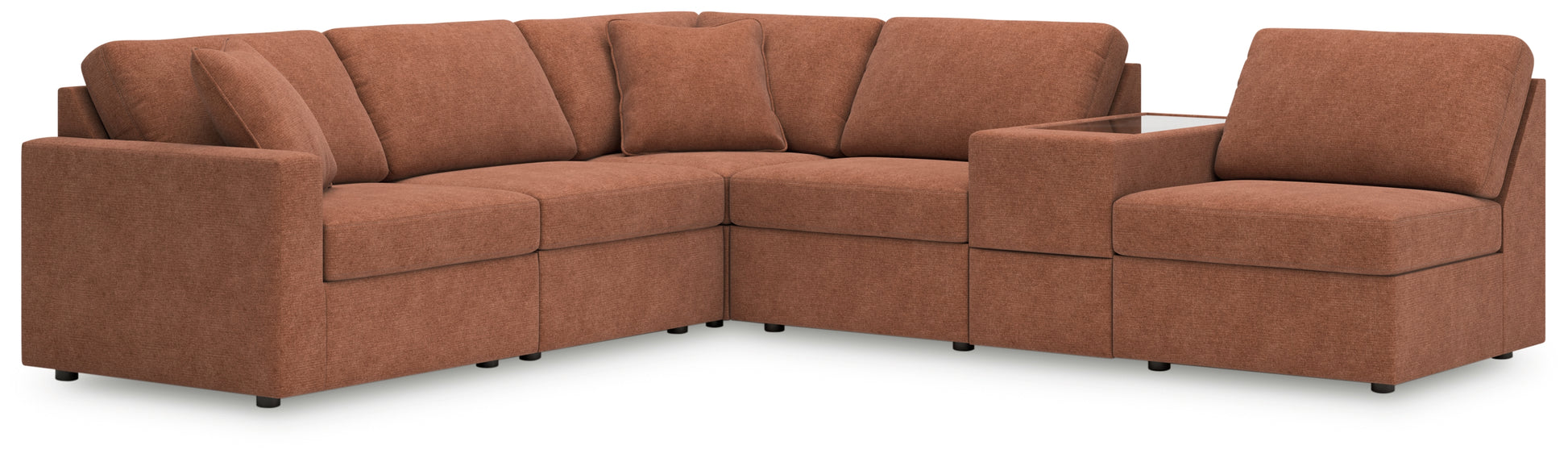 Includes 6 modular pieces: left-arm facing corner chair, 3 armless chairs, console with storage and wedge,