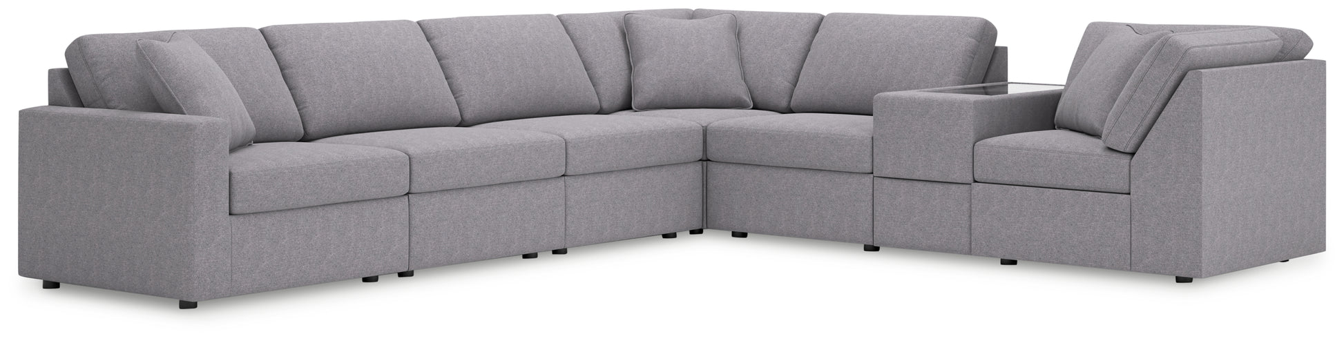 Includes 7 modular pieces: left-arm facing corner chair, 3 armless chairs, console with storage and 2 wedges,
