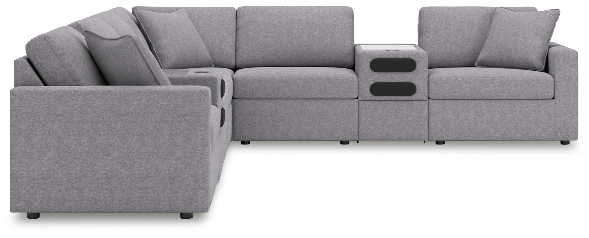 Looking cool and contemporary is great. But when it comes down to it, you’re all about low-maintenance lounging. With the performance fabric on this sectional with console, cleaning spills is a breeze. Its customizable modular design caters to your ever-changing needs, whether you need extra seating for guests or you\'re setting up for family movie night. And built-in speakers with wireless connectivity turn your living room into an entertainment hub. So grab some popcorn, settle in and enjoy the show.