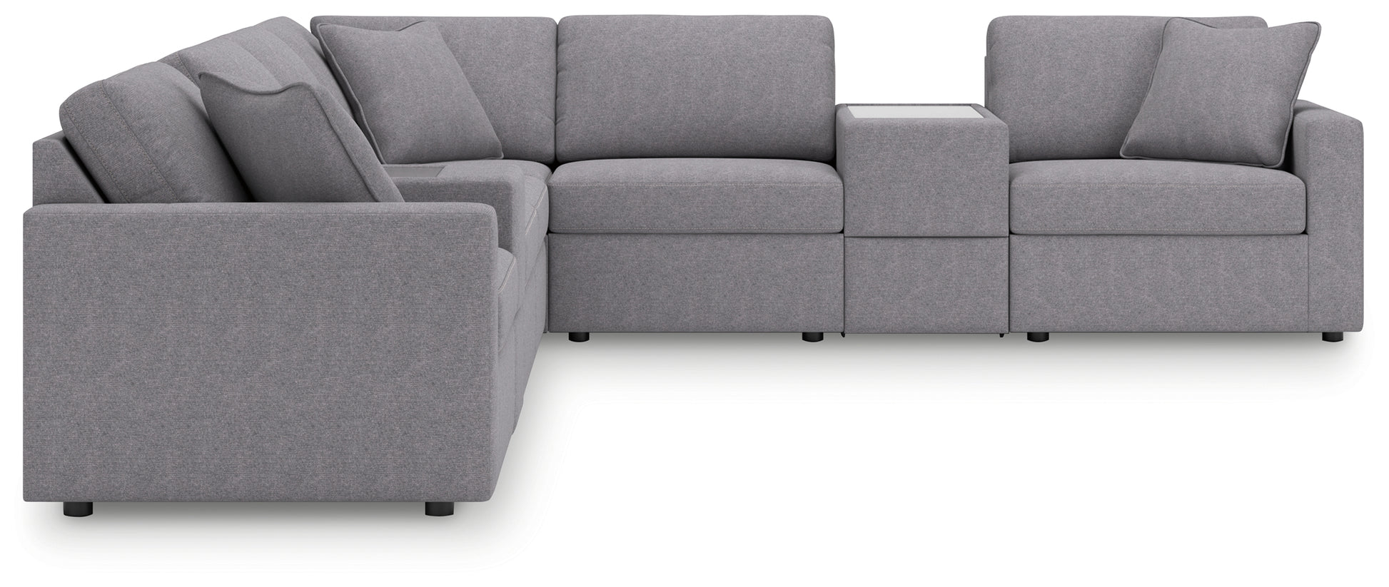Includes 8 modular pieces: left-arm facing corner chair, 3 armless chairs, 2 consoles with storage, wedge and right-arm facing corner chair,