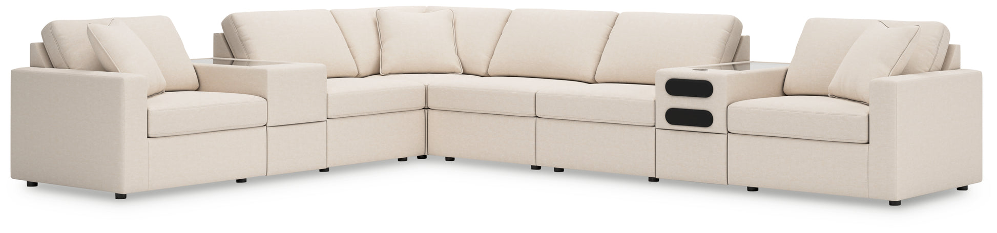 Includes 8 modular pieces: left-arm facing corner chair, audio console with storage, console with storage, 3 armless chairs, wedge and right-arm facing corner chair,