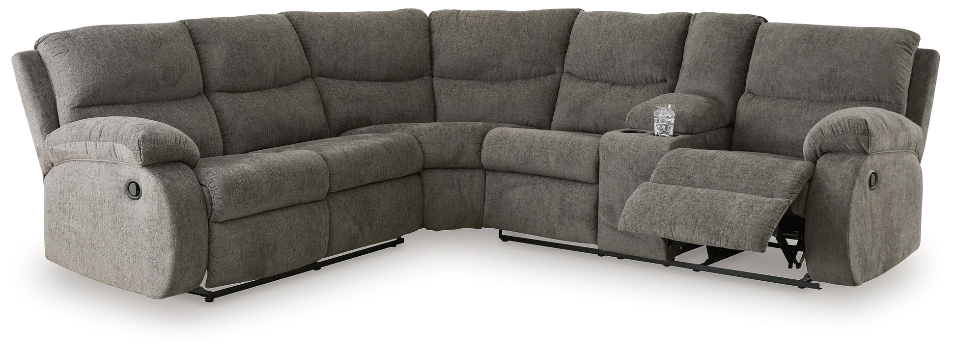 Cozy comfort is on the rise with this reclining sectional. So velvety soft, the trendy pewter-hued chenille upholstery is made for everyday indulgence. Overstuffed and stylishly wrapped, the sumptuous cushions and pillow top armrests display the comfortable side of contemporary. A padded center console with hidden storage and dual cup holders blends form and function. And with one easy pull, you\'re on your way to endless relaxation with plenty of room to stretch out.
