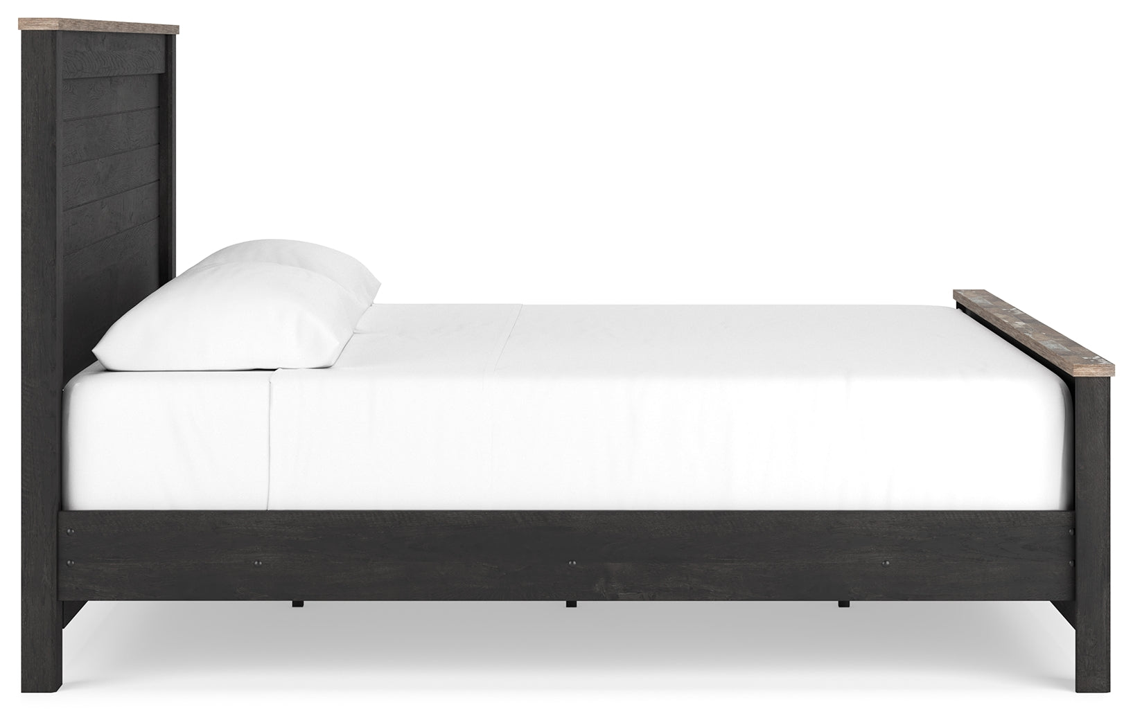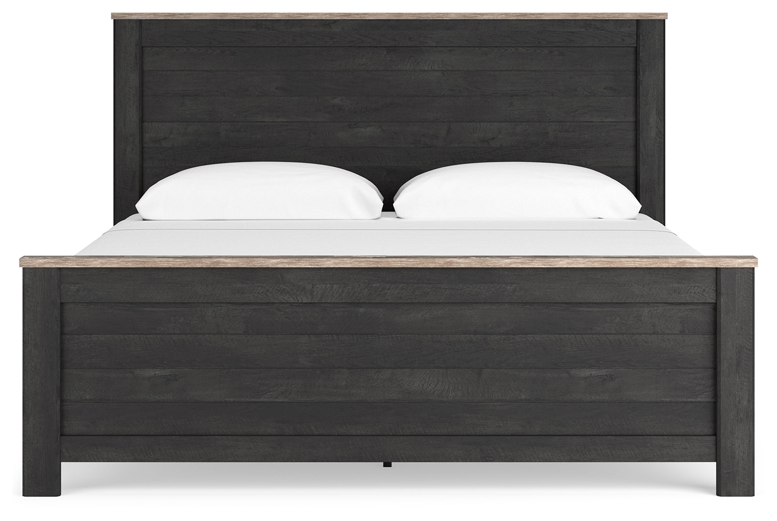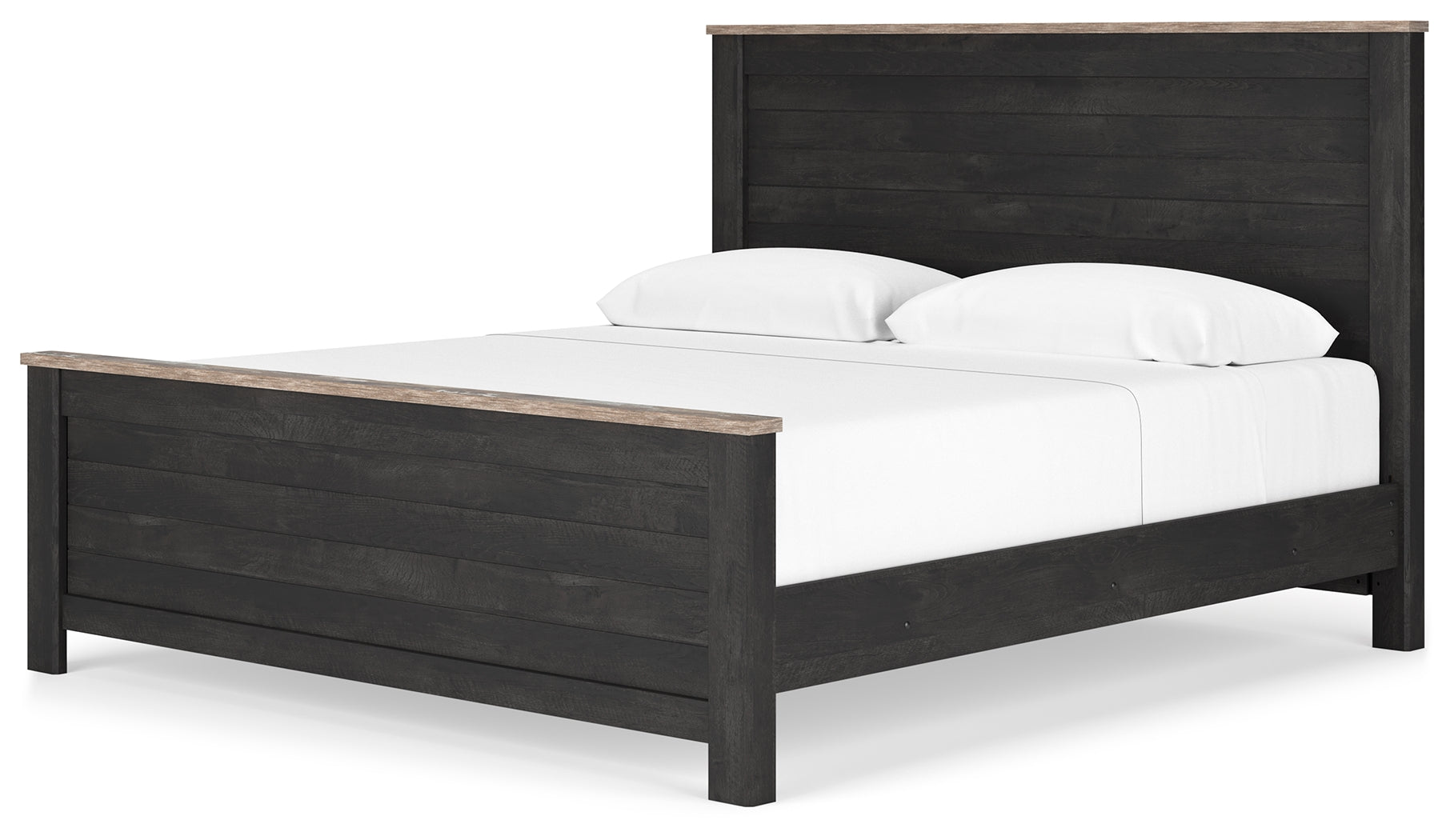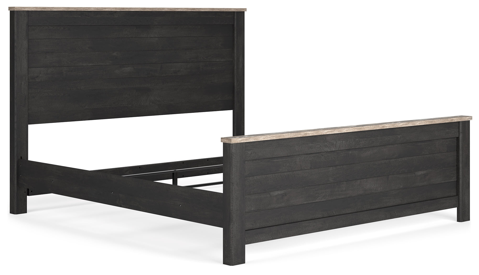 Charming French farmhouse aesthetics. Deep, industrial-inspired hues. This king panel bed balances beautiful simplicity with the luxurious details of yesteryear. The distinct two-tone finish is bold without sacrificing the piece\'s quaint character. And with its stunning large-scale silhouette, this bed is sure to appeal to your unique eye for vintage-inspired design. Dresser, mirror and nightstand included.