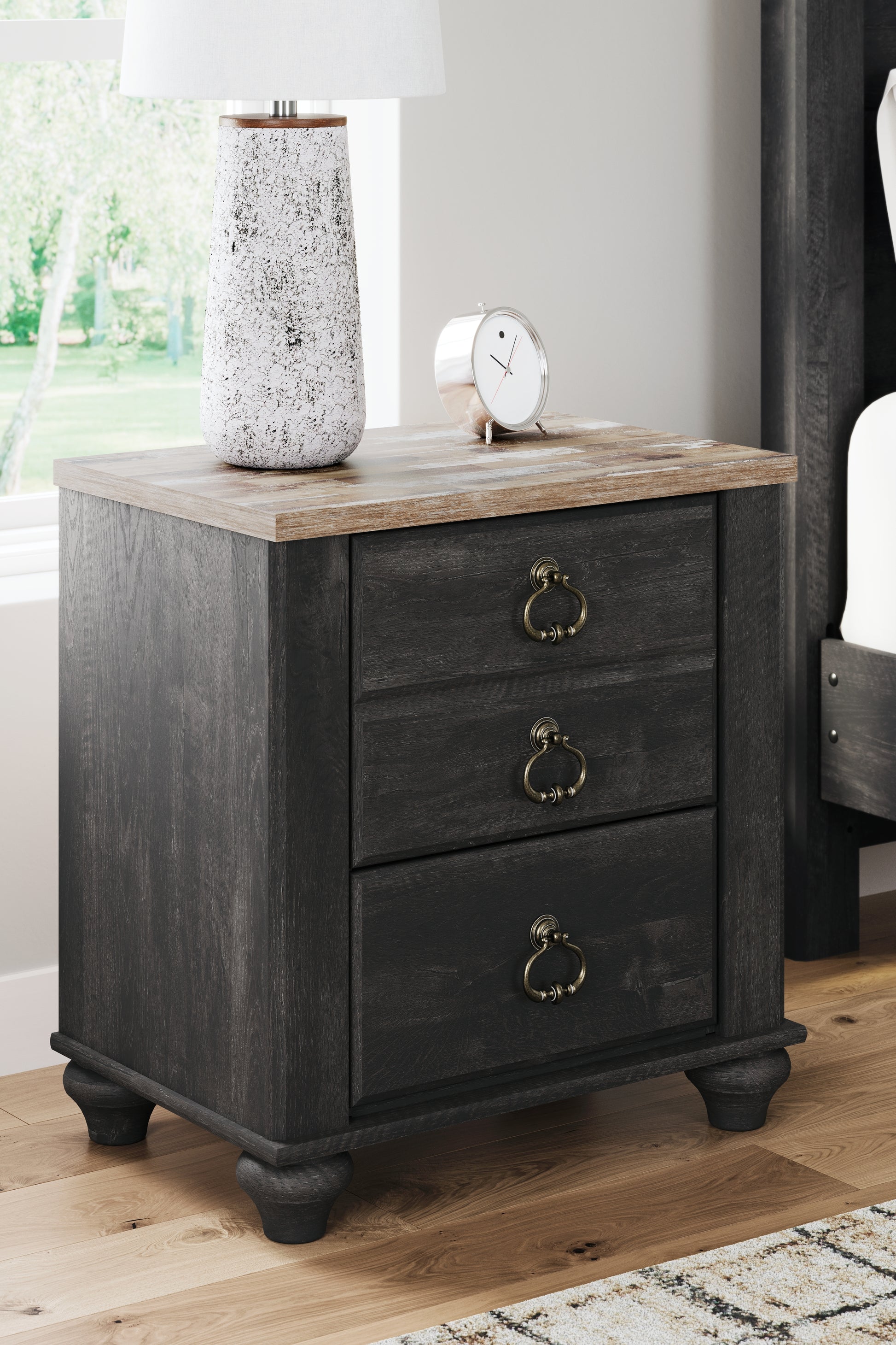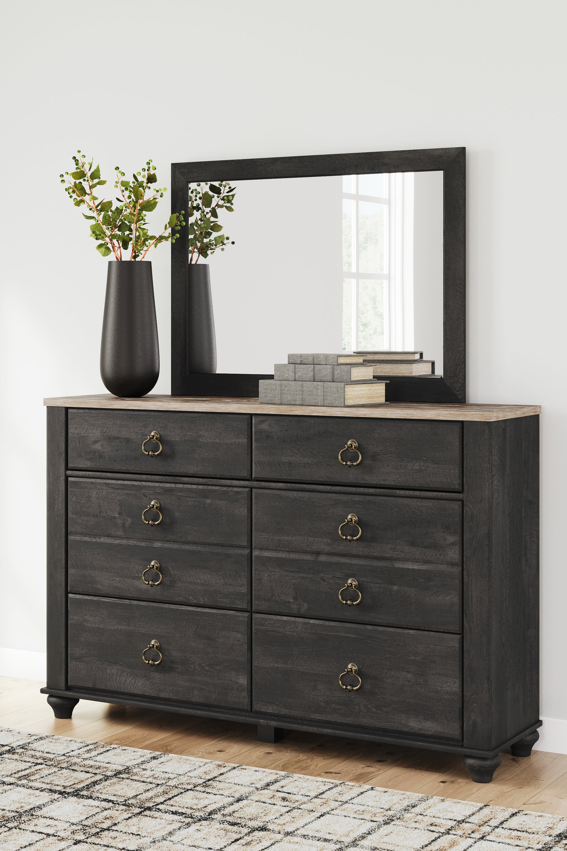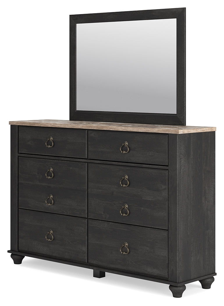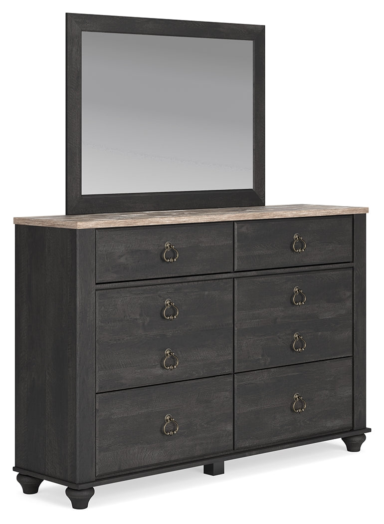 Charming French farmhouse aesthetics. Deep, industrial-inspired hues. This king panel bed balances beautiful simplicity with the luxurious details of yesteryear. The distinct two-tone finish is bold without sacrificing the piece\'s quaint character. And with its stunning large-scale silhouette, this bed is sure to appeal to your unique eye for vintage-inspired design. Dresser, mirror and nightstand included.
