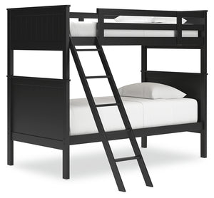 Maximize space and turn your kids\' bedtime into an adventure with this cool twin-over-twin bunk bed. It\'s an effortless addition to any bedroom, with a timeless Shaker style that\'s wonderfully finished in black. Guard rails on the top bunk help everyone get a good night’s rest. And the simplified design means easy assembly. Who doesn’t like that?