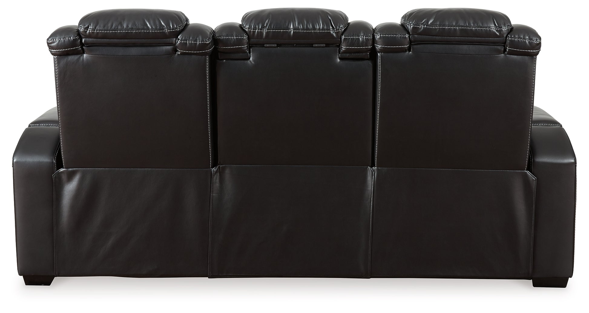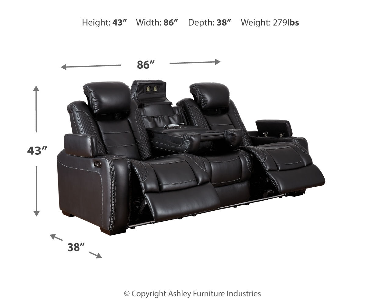 This power reclining sofa takes its cue from luxury automobiles with lattice- and cross-hatch stitching, for a richly tailored aesthetic that gives you plenty of reasons to celebrate. Sumptuously padded cushions and dramatic midnight black faux leather upholstery add to the indulgence. When it’s time to rev up the action, the sofa’s dual reclining bucket seats (middle seat is stationary), Easy View™ power adjustable headrests and center seat that folds down into a table keep you in the driver’s seat.