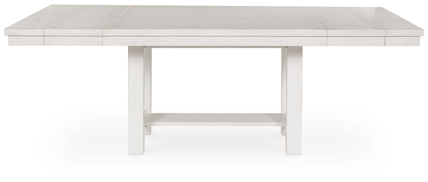 This dining package is sure to impress come mealtime. With its antiqued white finish and planked effect tabletop, modern farmhouse-style dining has never been so fashionable. All that’s missing is you and your family.
