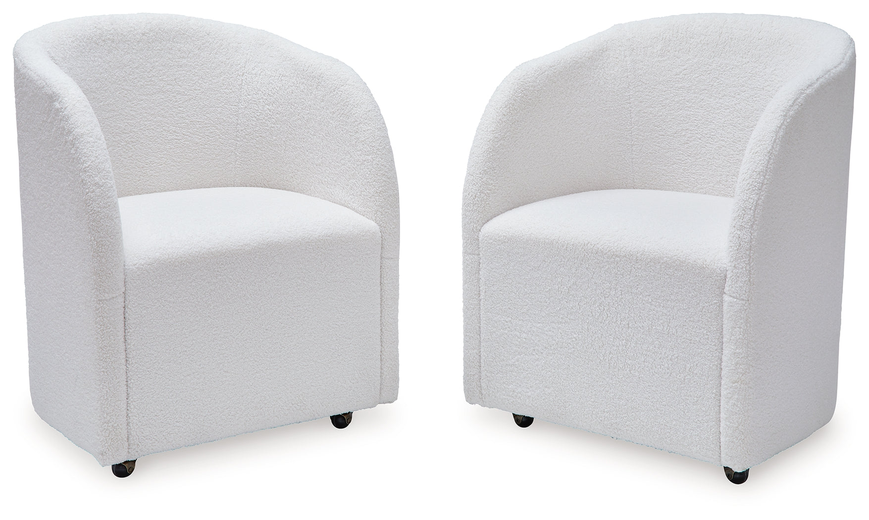 Inspired by art deco design, this fully upholstered dining chair makes a lasting impression in a simply stunning way. Its magnificent curved silhouette is enhanced with a neutral boucle upholstery that’s so pleasing to the palate. This is the piece you’ve been looking for to elevate your contemporary decor whether you’re dining, listening to your latest playlist or binge-watching with friends. Plus, it’s set on casters so it’s easy to move around.