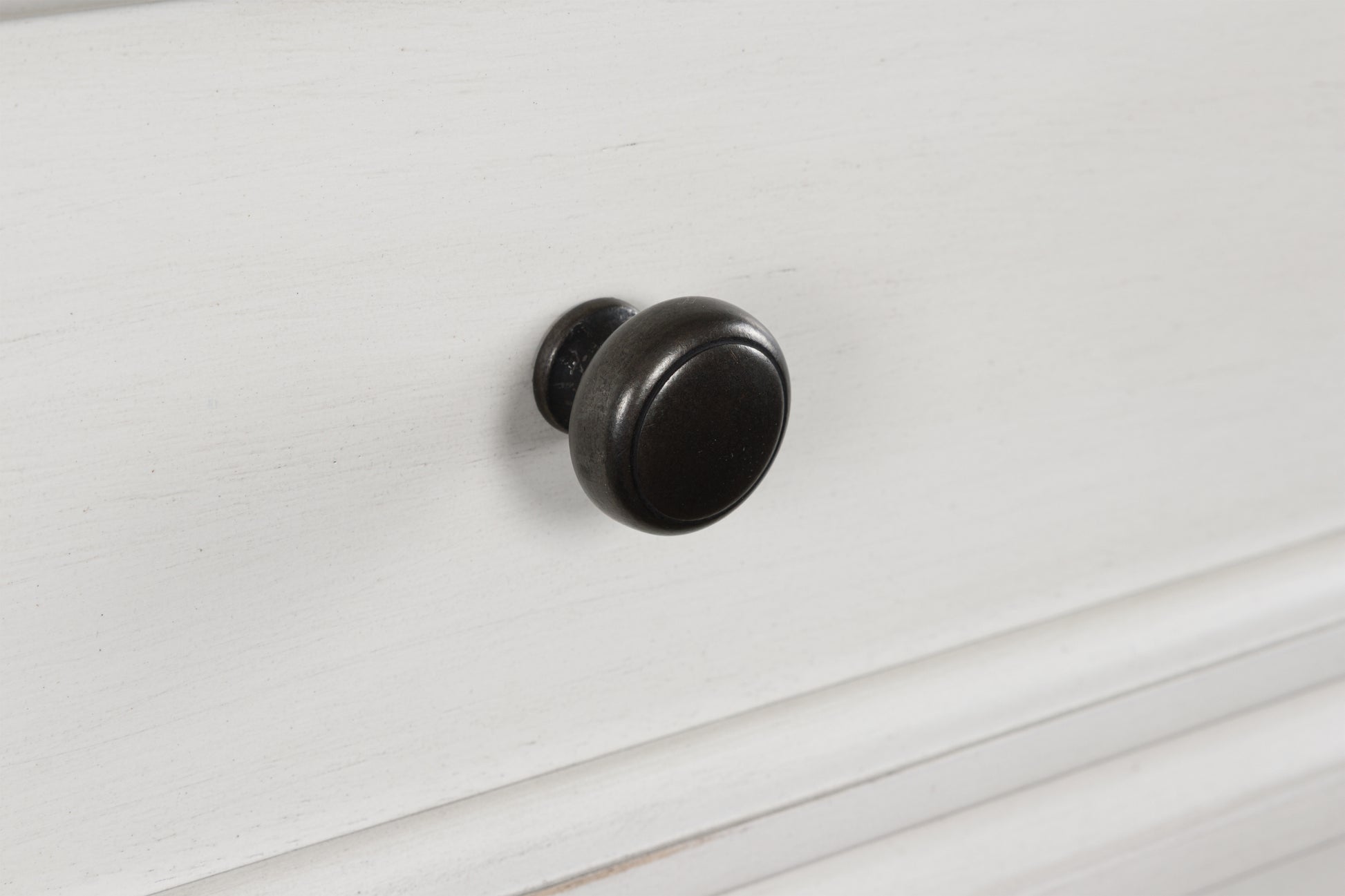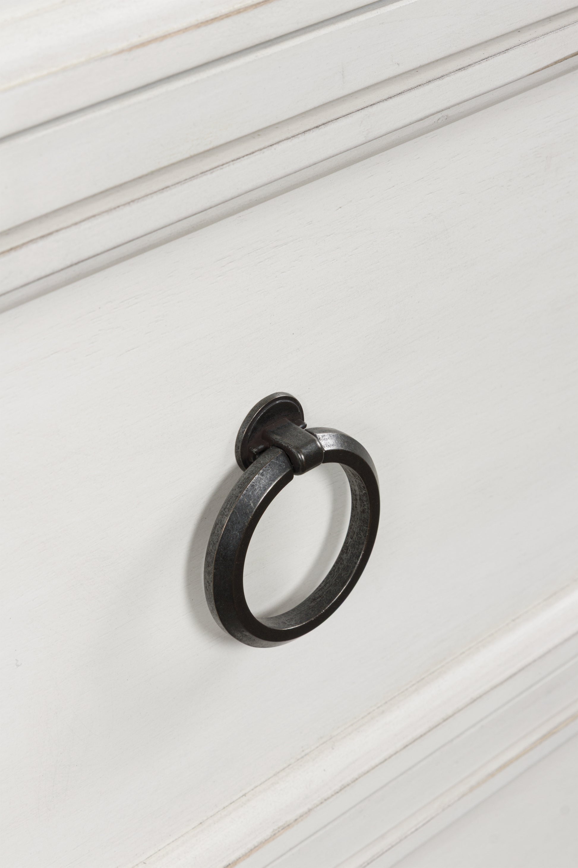 Taking a laid-back approach to casual traditional design, this artfully crafted chest of drawers combines classic elements with a clean modern approach. Its rubbed antiqued white finish exudes a comfy, timeless appeal that\'s sure to carry you away to a dreamy time and place. Simple round metal knobs and ring pulls on the chest\'s spacious drawers make just the right statement.