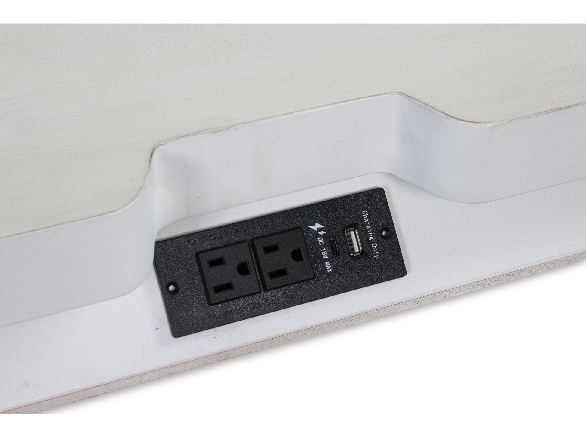 Taking a laid-back approach to casual traditional design, this artfully crafted nightstand combines classic elements with a clean modern approach. Its rubbed antiqued white finish exudes a comfy, timeless appeal that\'s sure to carry you away to a dreamy time and place. The simple round metal knob and ring pulls on the nightstand\'s spacious drawers make just the right statement, while an integrated power outlet and USB charging keep your devices powered up overnight.