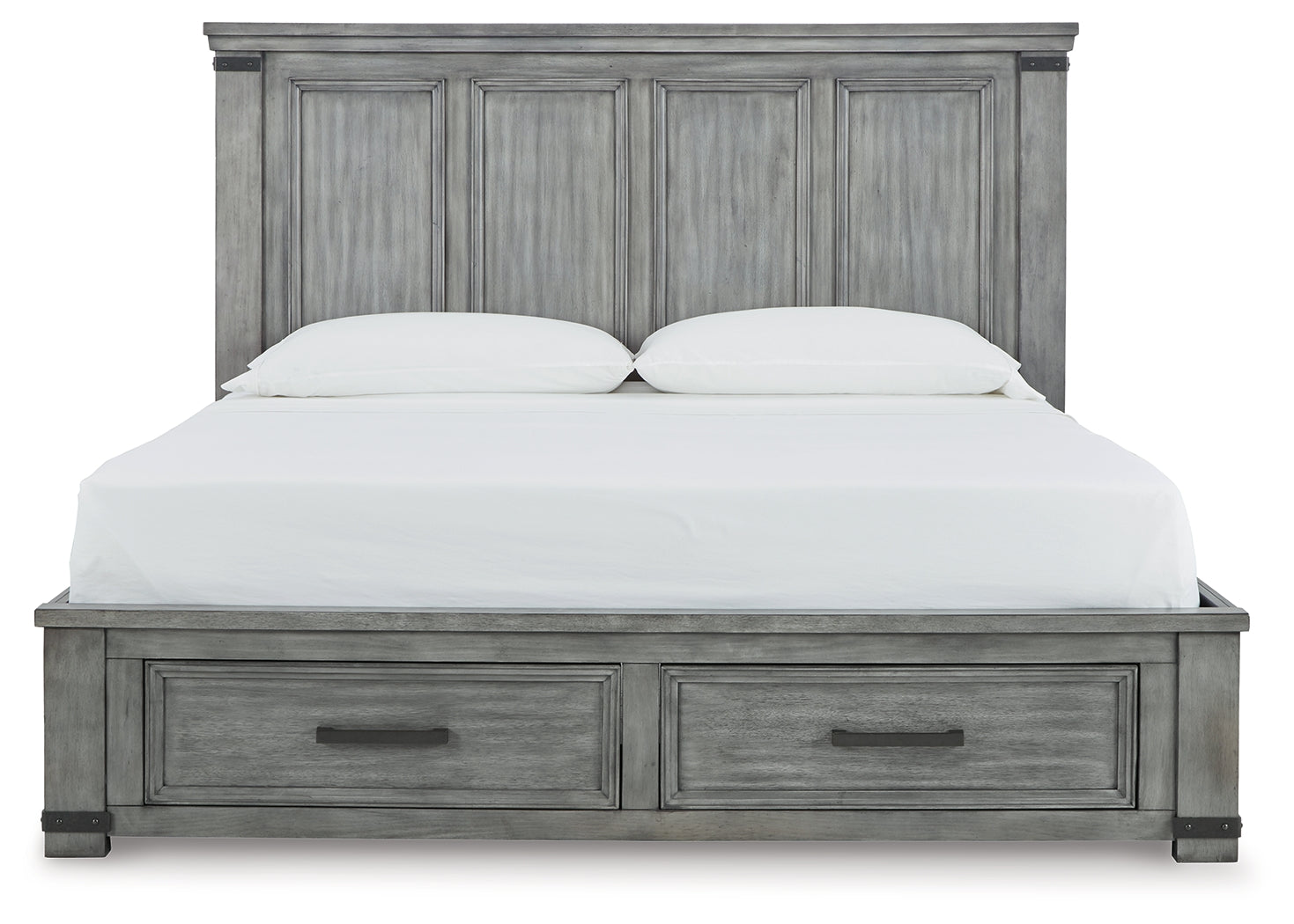 With its light weathered gray coloration, this storage bed conveys trend-right urban farmhouse style. Thick-profiled top moulding on the tall, mansion-scale headboard lends a fresh take on a timeless design. The footboard features two storage drawers with profiled frames and dovetail construction. Bar pulls and metal straps in a dark aged bronze tone add to the rustic-yet-refined aesthetic.