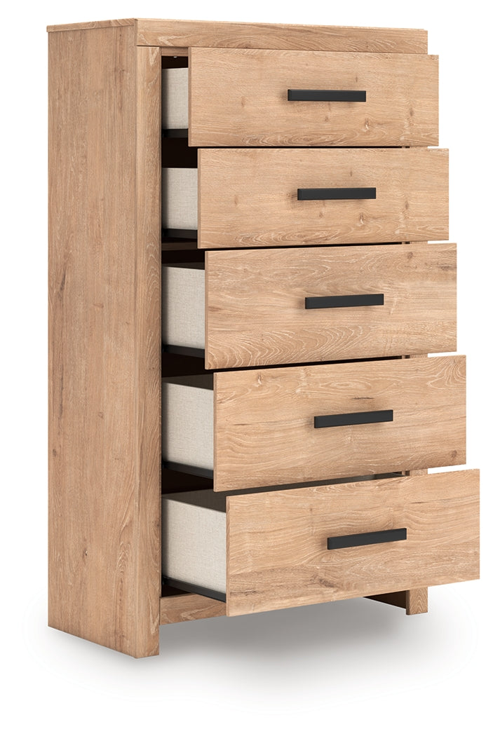 This chest of drawers brings a touch of modern farmhouse charm to your home. Its light oak finish and clean lines have a fresh, airy feel, effortlessly creating an inviting atmosphere for a restful night’s sleep. Five spacious drawers with large black handles provide plenty of storage for all your nighttime essentials.