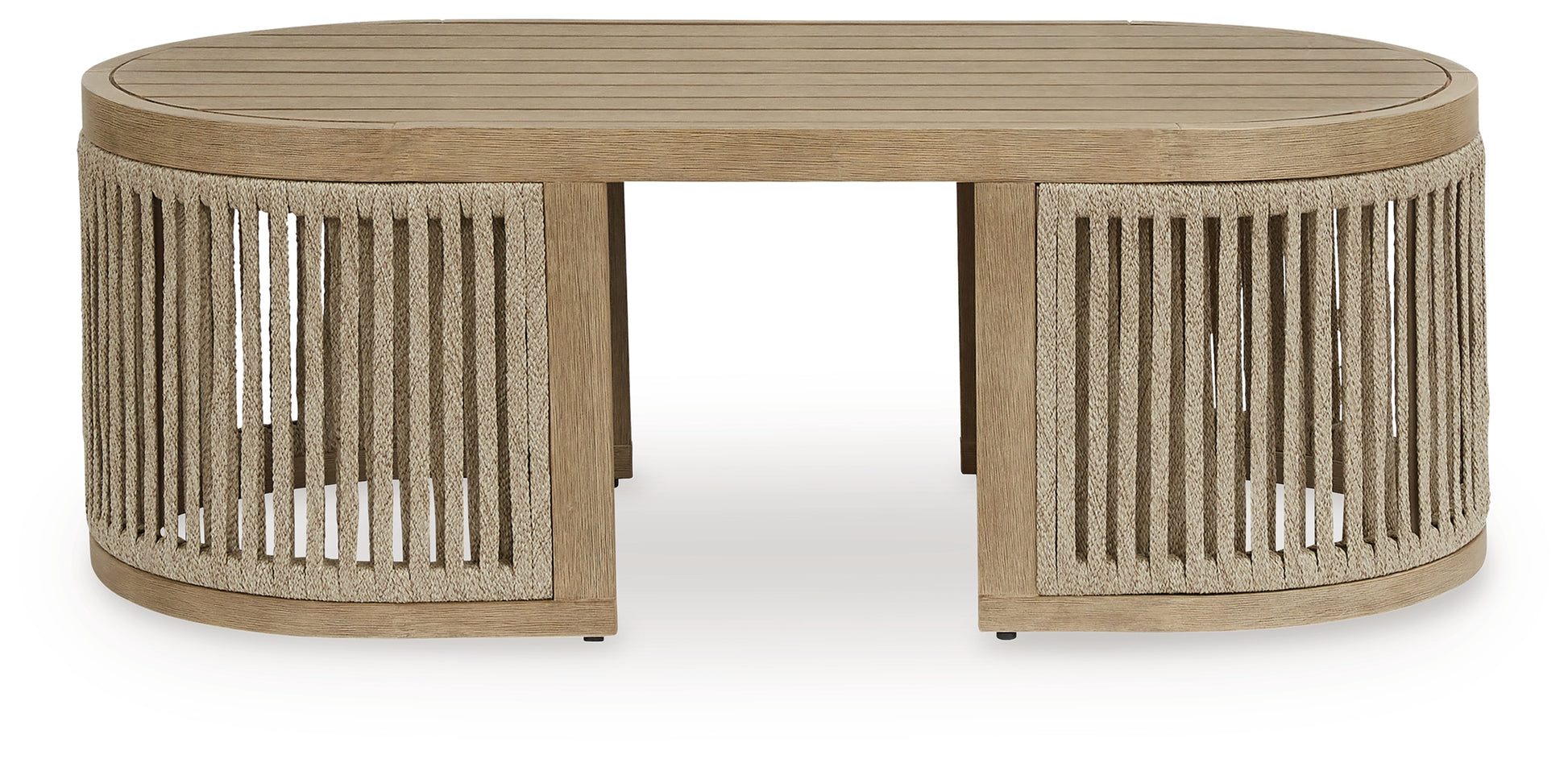 Round out your outdoor living space with the naturally beautiful look of wood. This coffee table will serve up seasons of relaxation on your back deck or sitting pretty by the pool. A gently curved open-weave design, crafted from eucalyptus wood and polyester rope, is the perfect merger of high fashion and lasting durability. It\'s just the spot for sips and snacks.