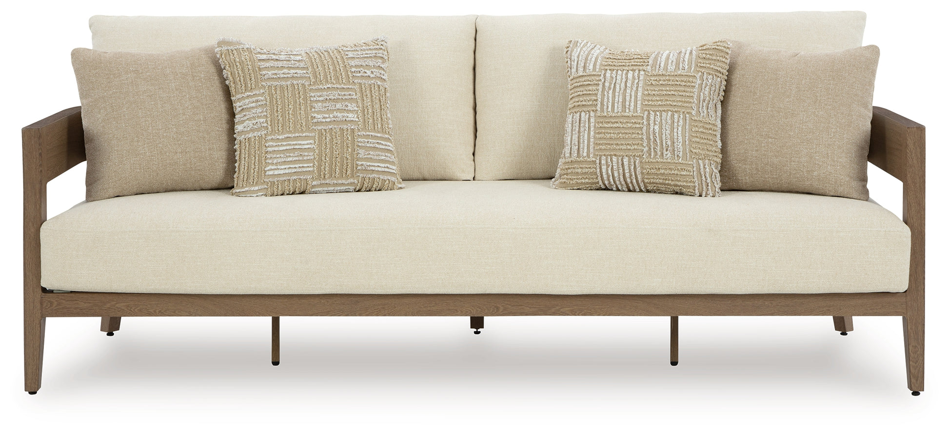 Elevate the appeal of easy-breezy living with this outdoor sofa. Made to look like wood yet durable enough to weather the elements, it\'s sure to serve you and your besties well, year after year. The gently curved piece features cushions wrapped in Nuvella+™ high-performance fabric for plush refinement. Patterned accent pillows infuse delightful texture.