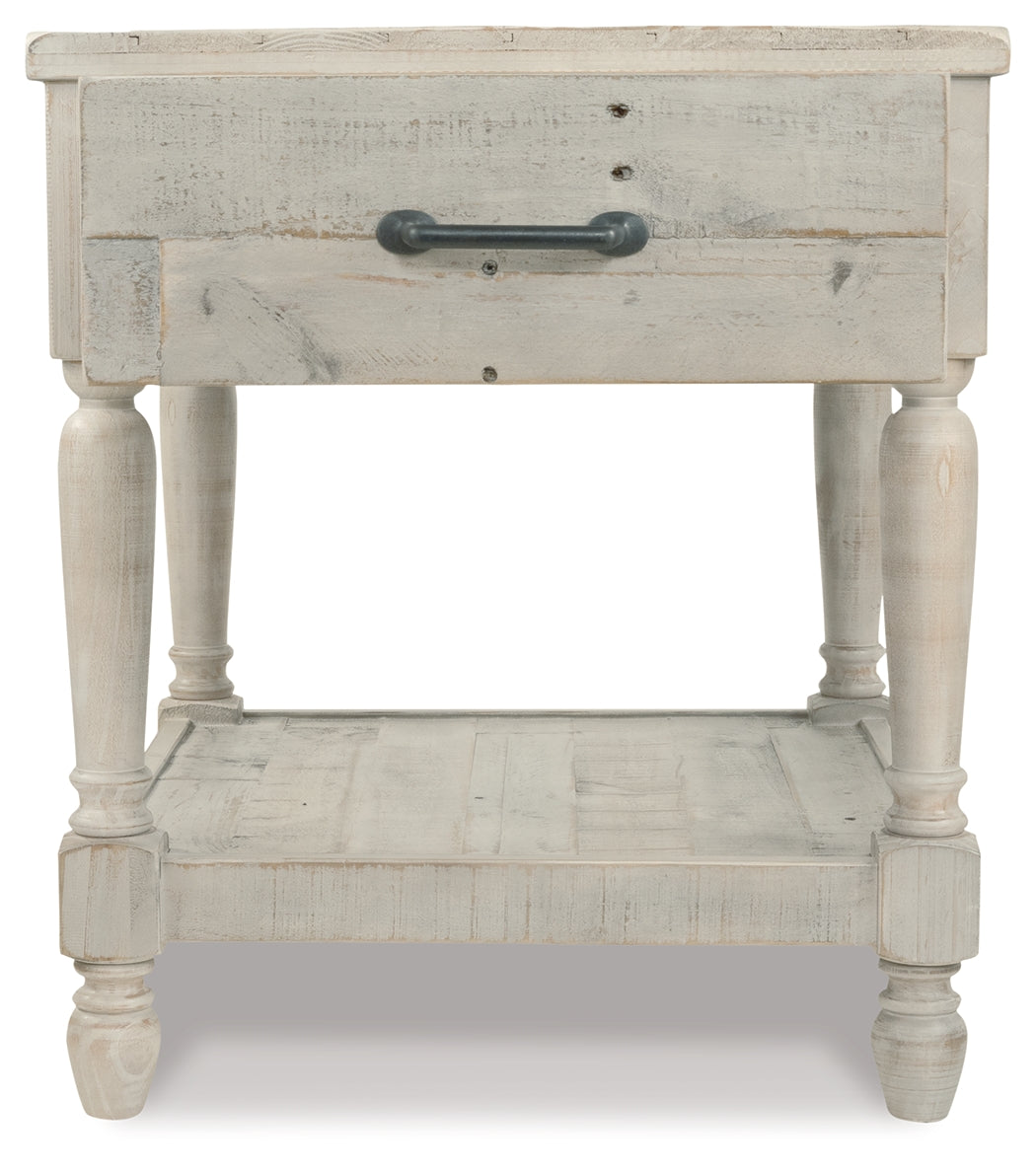 Inspired pieces create inspired spaces. This rectangular end table charms your home with farmhouse style. White textural finish highlights the weatherworn feel of the reclaimed wood and purposeful nail holes. Roomy drawer puts essentials out of sight. Display fashionable books or decor on the planked tabletop and bottom shelf.