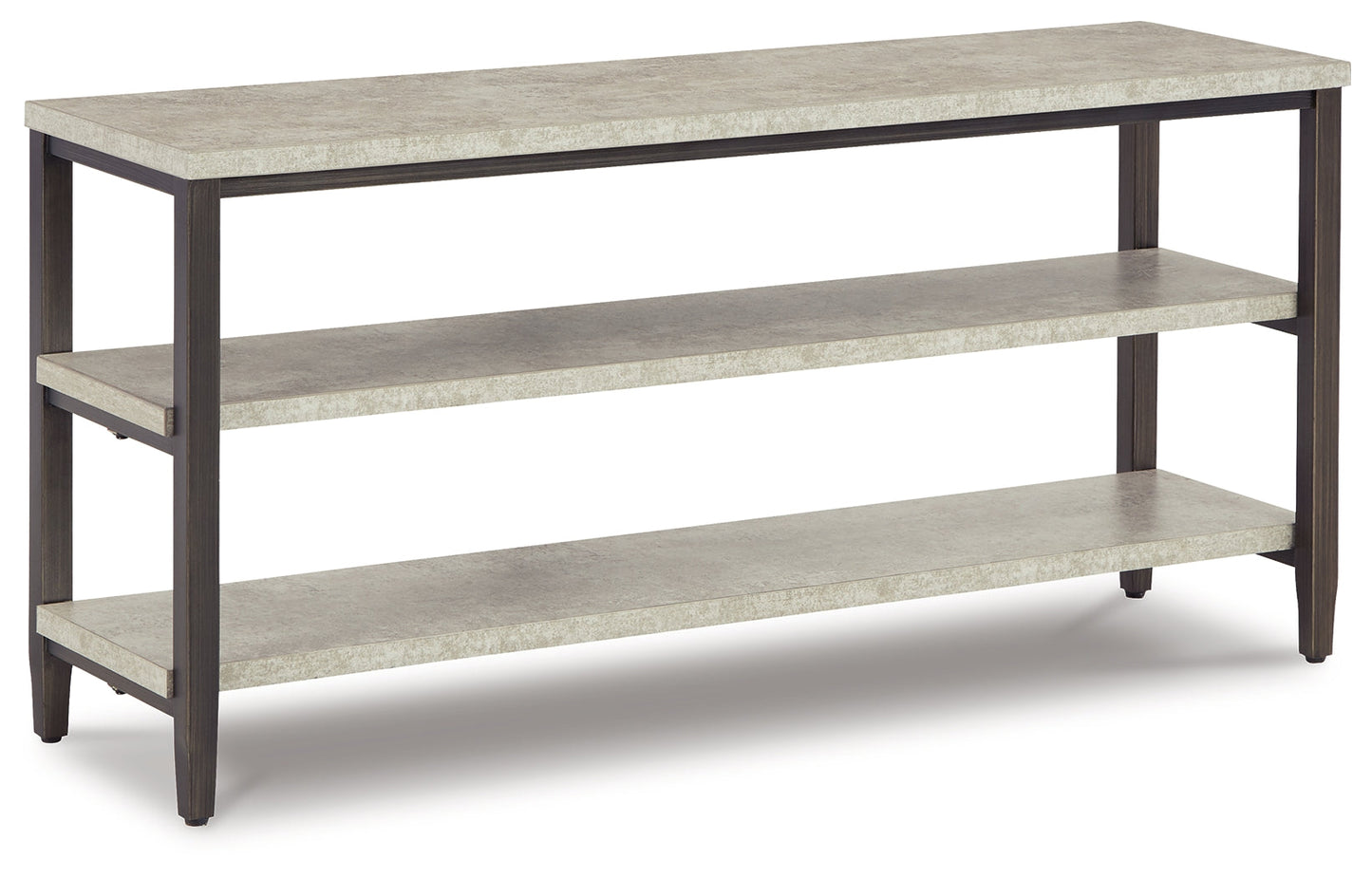 With its casual, linear style design, this spacious sofa table works wonderfully well with larger sofas and sectionals. You\'ll easily make use of the handy open storage that the two shelves have to offer. Features faux concrete melamine top with metal base in a aged bronze-tone finish.