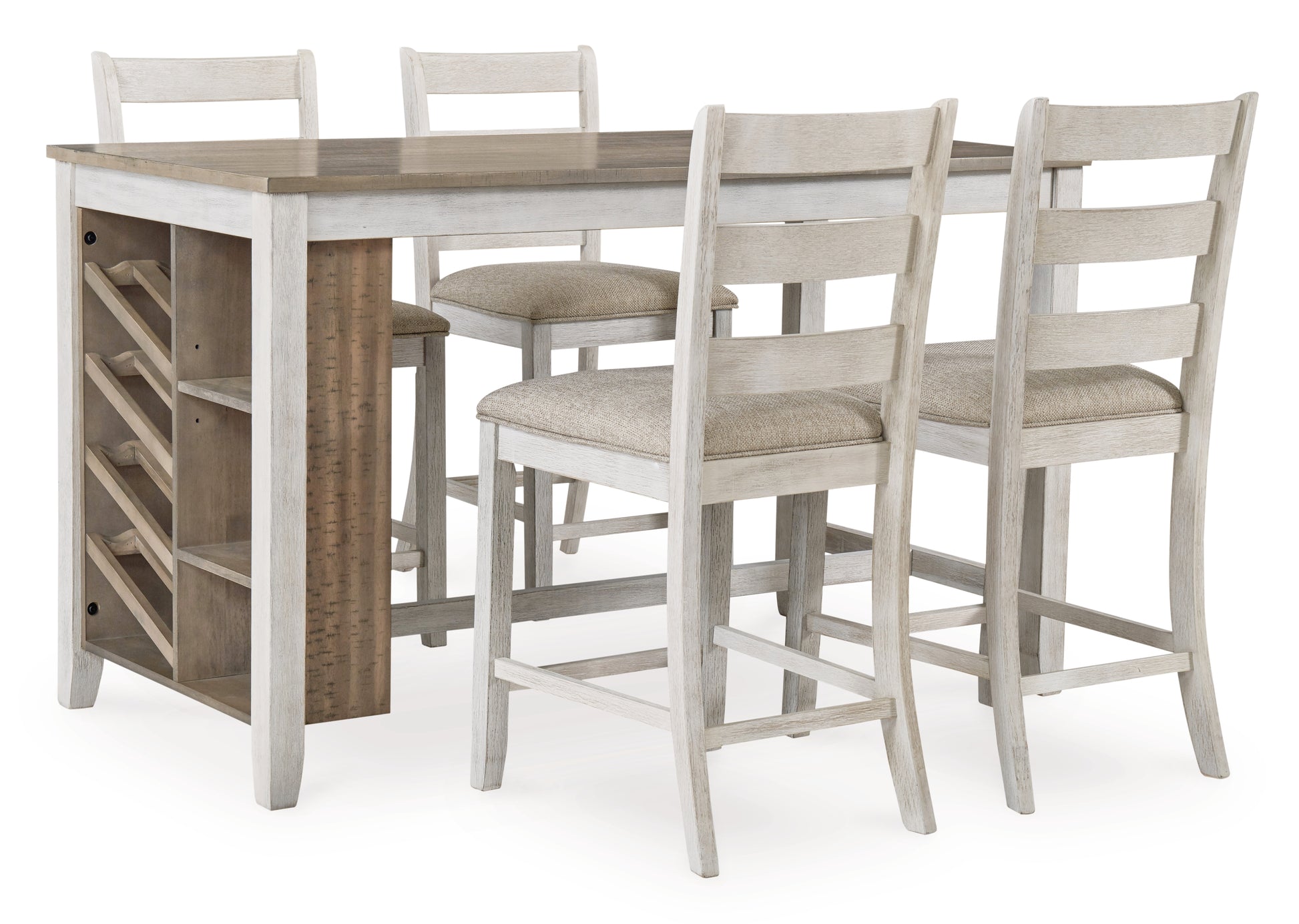 Raise the bar on small space living with this 5-piece counter-height dining set. An inspired choice for coastal chic or modern farmhouse settings, this strikingly simple table marries a brown tone plank-effect top with a rubbed-through grayish white base for timeworn appeal. The table’s side shelves and 8-bottle wine rack cleverly balance form and function while the comfortably cushioned bar stools with classic ladderback styling serve up high style.