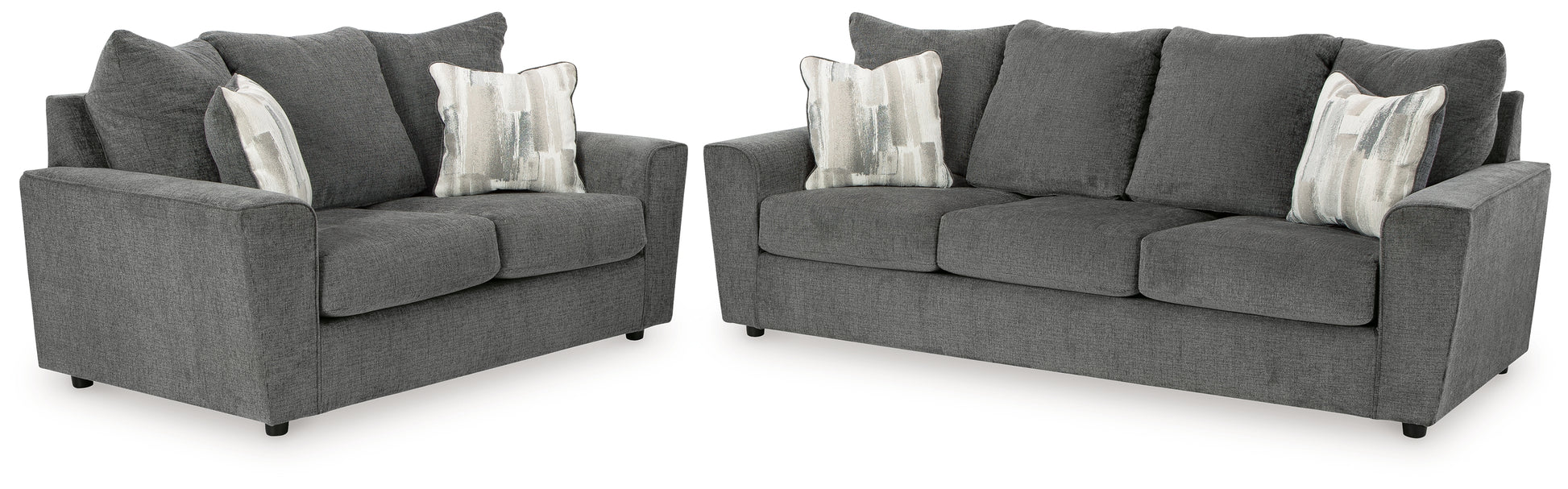 What’s new in neutrals? Shades of gray, of course. Embrace the sophisticated design trend with this gorgeous sofa and loveseat set, which offers a clean-lined, contemporary style at a comfortably cool price. Sure to lift your spirits, the plush chenille fabric is fabulously neutral. Contemporary flared arms give it a distinctive flair. This set also arrives with four cool brushstroke accent pillows to elevate the taste and comfort level.